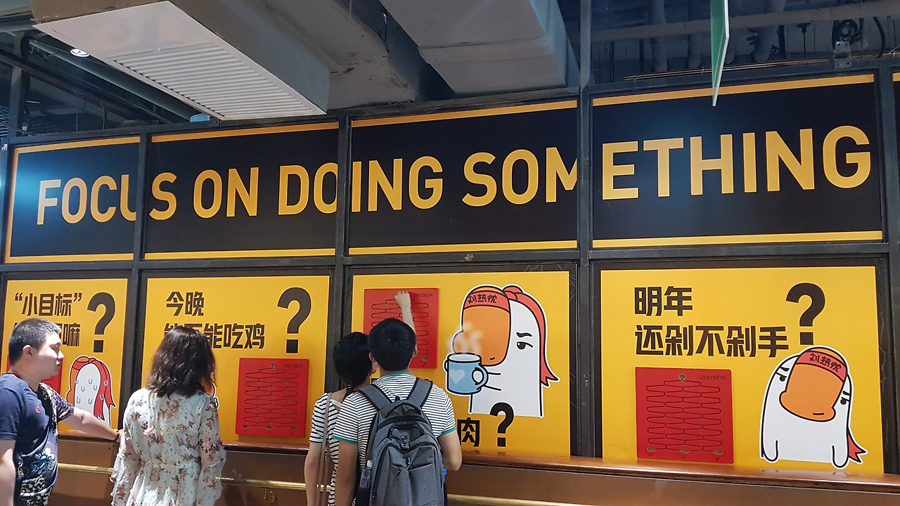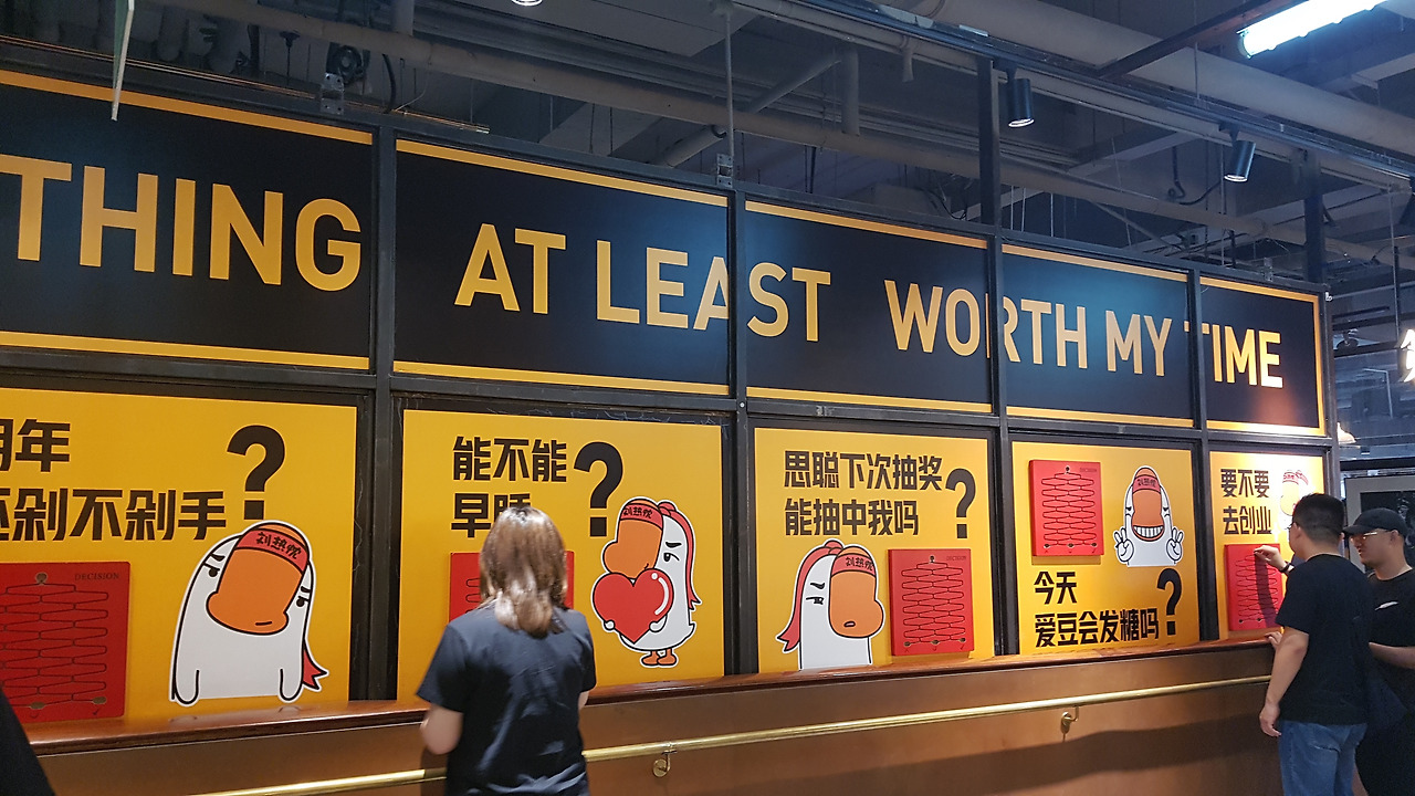 톈진 사람들의 젊은 주말을 둘러보다가 재밌는 모습을 발견했다. 여러 가지 질문이 적혀 있고 구슬을 위에서 넣어서 그 구슬이 어디 도착하는지에 따라 답을 주는, 어떻게 보면 결정장애를 위한 결정판 같은 것이었다. 그 질문의 내용이 또 좀 재밌는데, "오늘 저녁에 치킨 먹어도 될까?" "내년에도 이렇게 잔뜩 뭘 사게 될까?" "일찍 잘 수 있을까?" "내가 좋아하는 아이돌이 오늘 떡밥을 뿌리려나?" "창업을 해도 될까?" 같은, 이런 결정판에 맡기기는 좀 웃긴 질문들이었다. 그리고 지나가던 톈진 청년들은 열심히 그 질문들에 구슬을 넣어보고 있었다. 톈진의 젊은이들이 무엇을 신경 쓰고 있는지를 알 수 있는 부분이다. 먹는 것, 사는 것, 부자가 되는 것, 덕질, 창업... 우습게도 그 대부분이 한국의 청년들도 고민하는 문제인 것 같았다. 결국 오늘을 사는 청년들은 다 비슷한 생각을 하며 사는 걸까. 어쩐지 좀 허무해졌다.