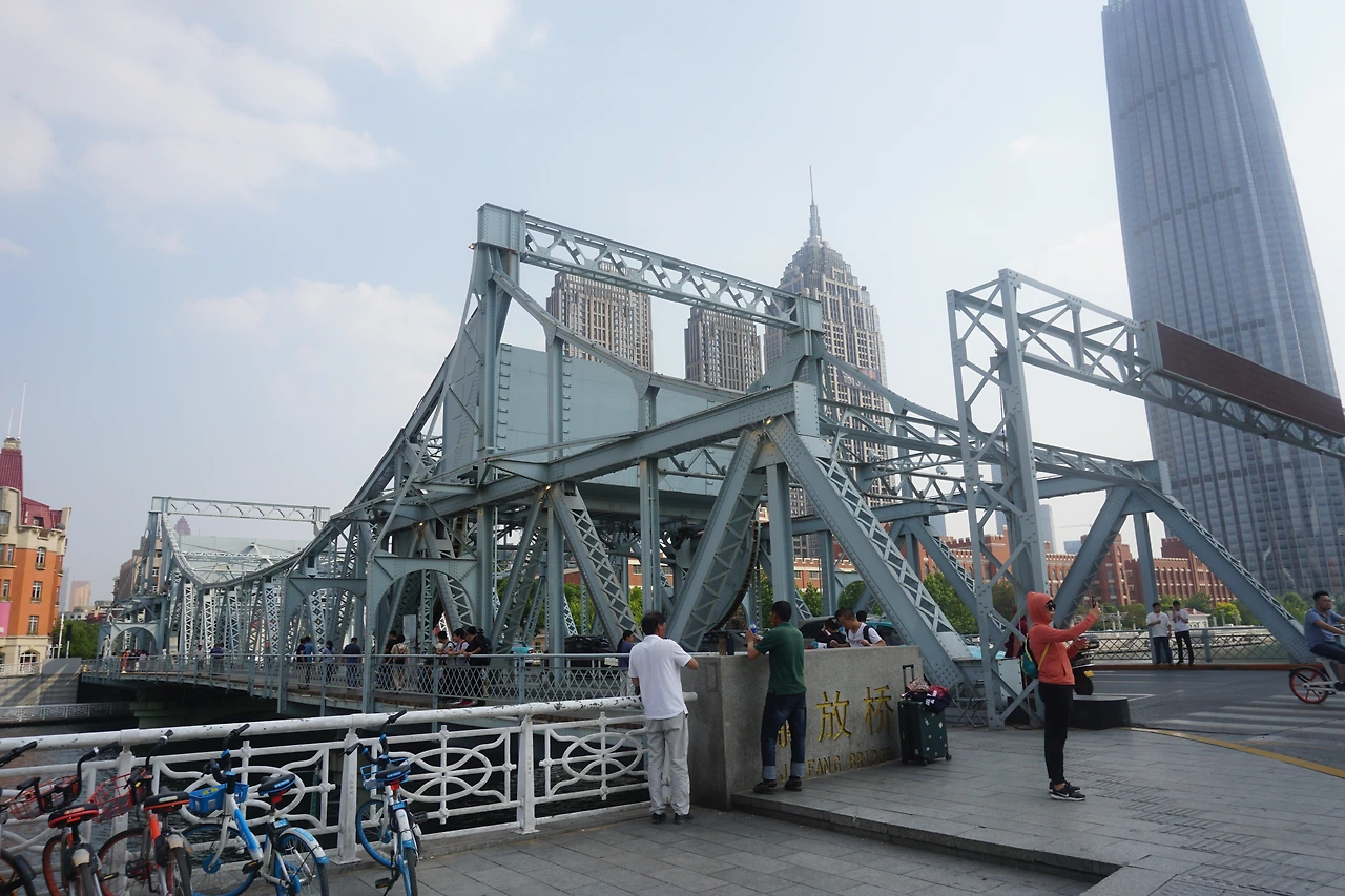 강의 시작을 보기 위해 정한 지점은 위쪽 좌측 사진인 세기종광장(世纪钟广场). 역사가 깊은 장소는 아니지만, 2000년 1월 1일, 새로운 세기가 시작되던 그때를 위해 준비했던 이 종은 실제로 당일 톈진 사람들에게 명량한 종소리를 들려주었다고 한다. 사실 이 종이 설치된 지점이 톈진에서는 좀 역사가 깊은데, 종 바로 앞에 위치한 해방교(解放桥)가 그것이다. 위쪽 우측 사진에 보이는 다리를 보면 된다. 전체적으로 모두 철강으로 만들어진 이 다리는, 세계 여러 나라의 조계지가 톈진에 만들어졌을 당시 톈진 기차역 광장과 조계지 구역을 잇는 다리였다고 한다. 그 외양이 상하이의 외백대교(外白渡桥)를 생각나게 하는데, 쓰임도 조계지 사람들의 통행을 위한 것이었으니 어찌 보면 비슷하다고 할 수도 있겠다.
