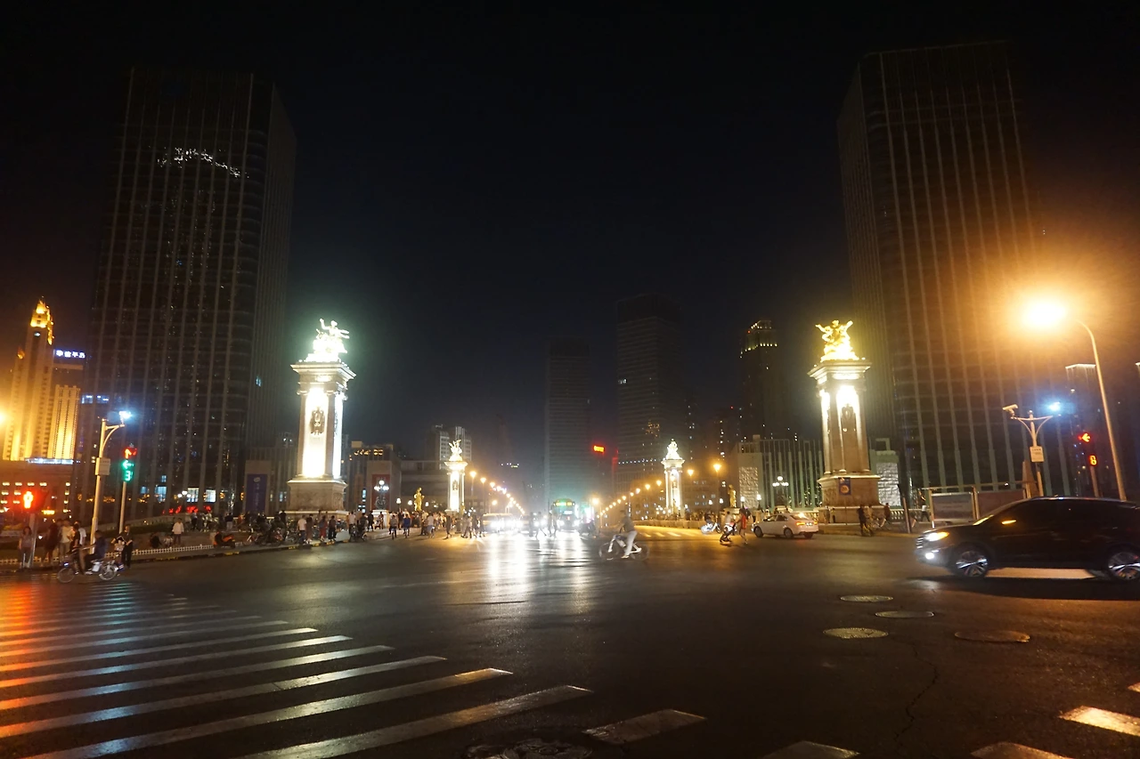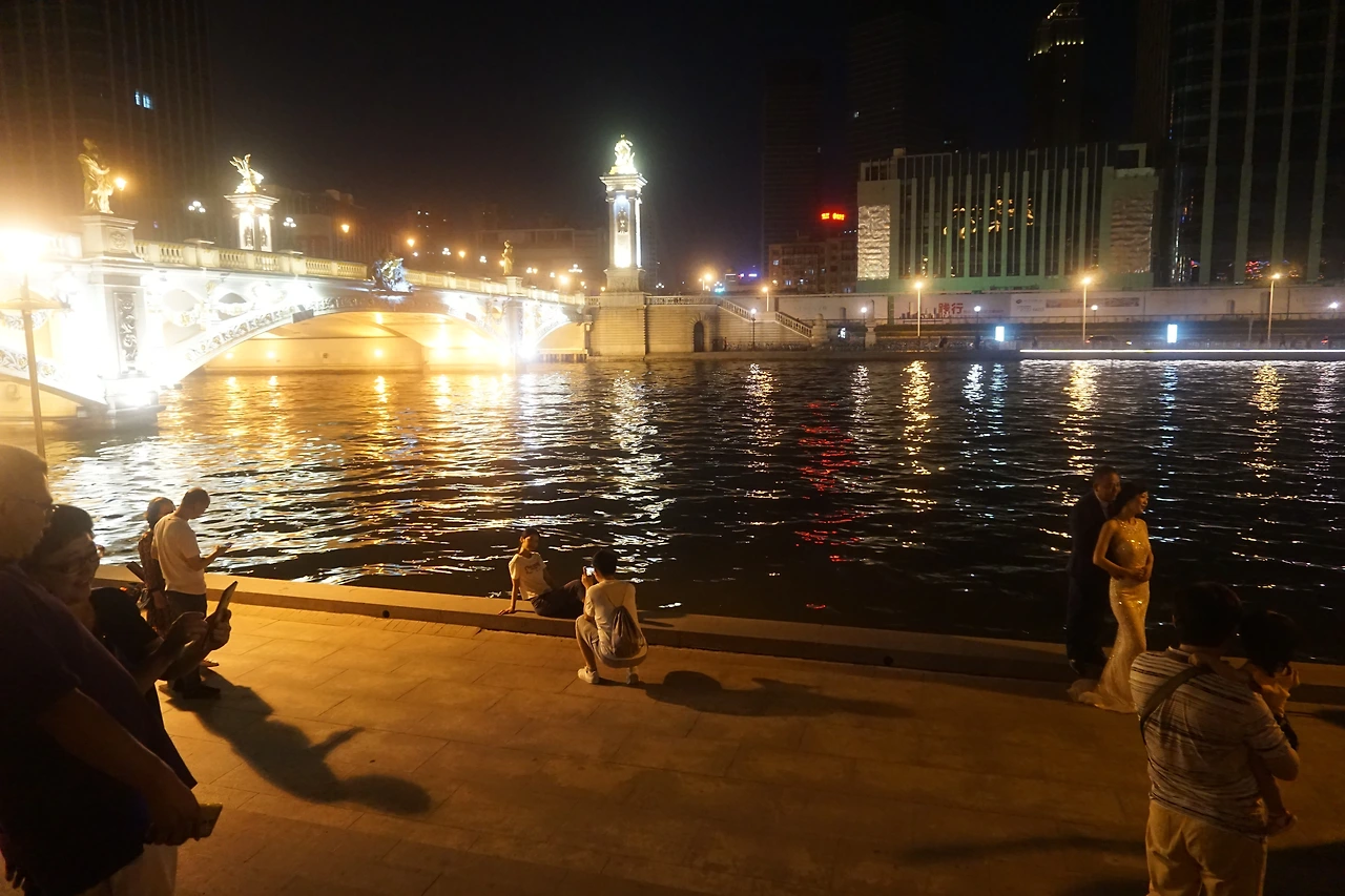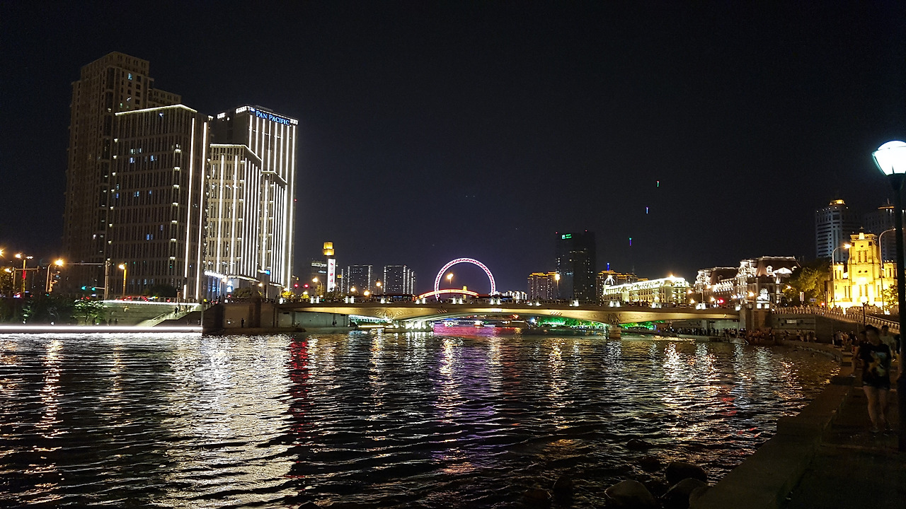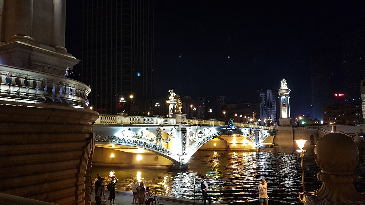 어두운 밤이 찾아왔고 우리는 이탈리아 풍경구를 나서 다시 하이허 강변으로 향했다. '톈진의 눈(天津之眼)'이라는 관람차의 야경이 예쁘다는 이야기를 들었기 때문이다. 다시 풍경구의 입구를 나와 앞서 지나온 다리 근처로 가는데 다리를 장식하고 있던 기둥과 동상들에 모두 밝은 빛이 들어와 있는 모습이 보인다. 다리 주변에 광장이 있어서 그런지 많은 사람들이 강바람을 쐬며 저녁의 여유를 즐기고 있었다.