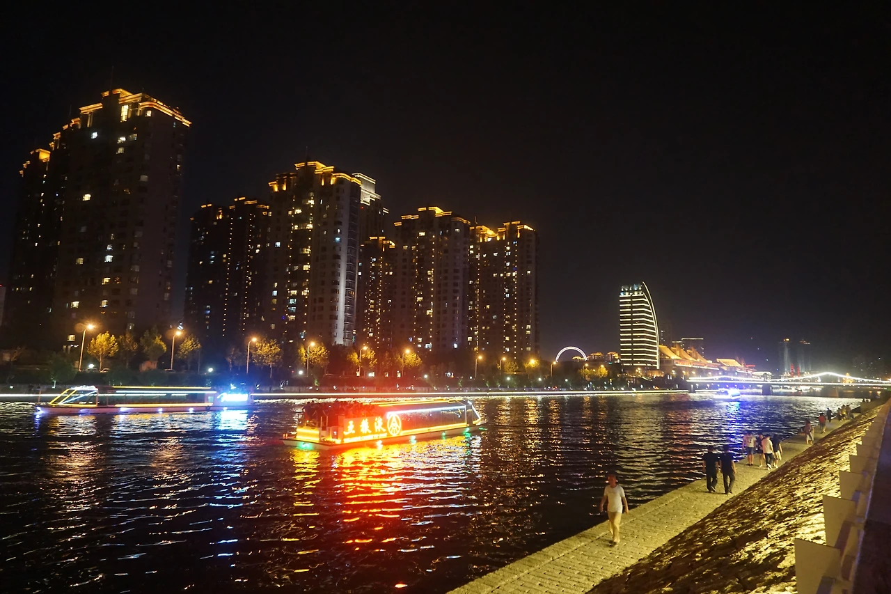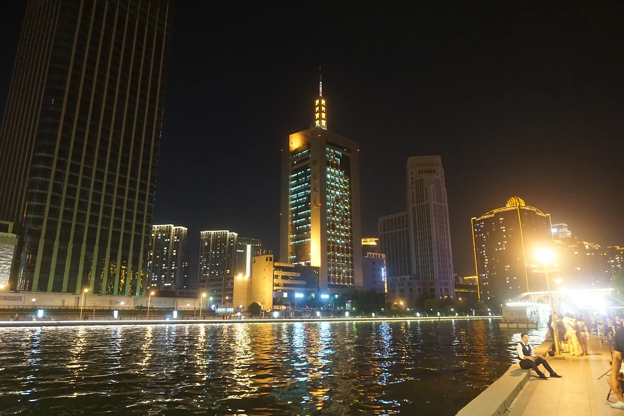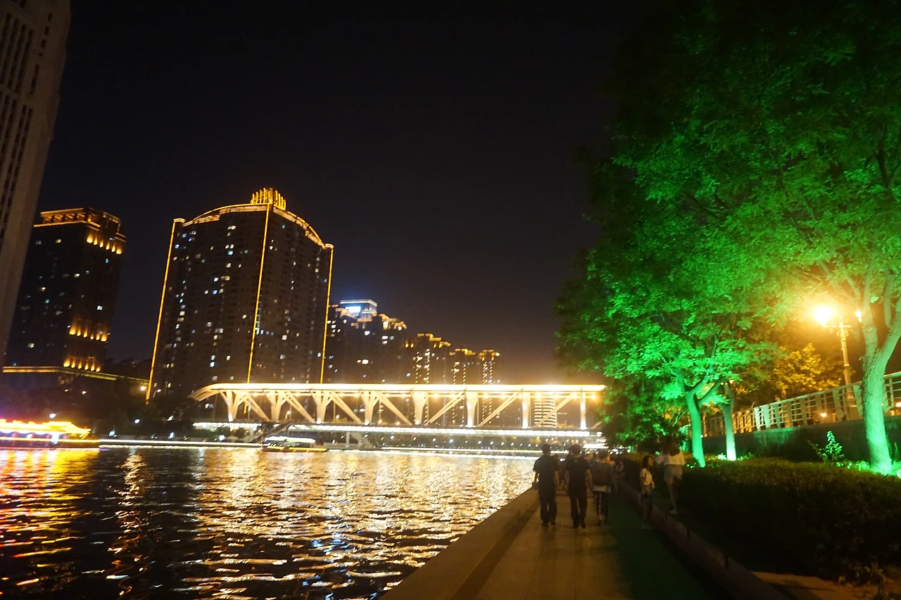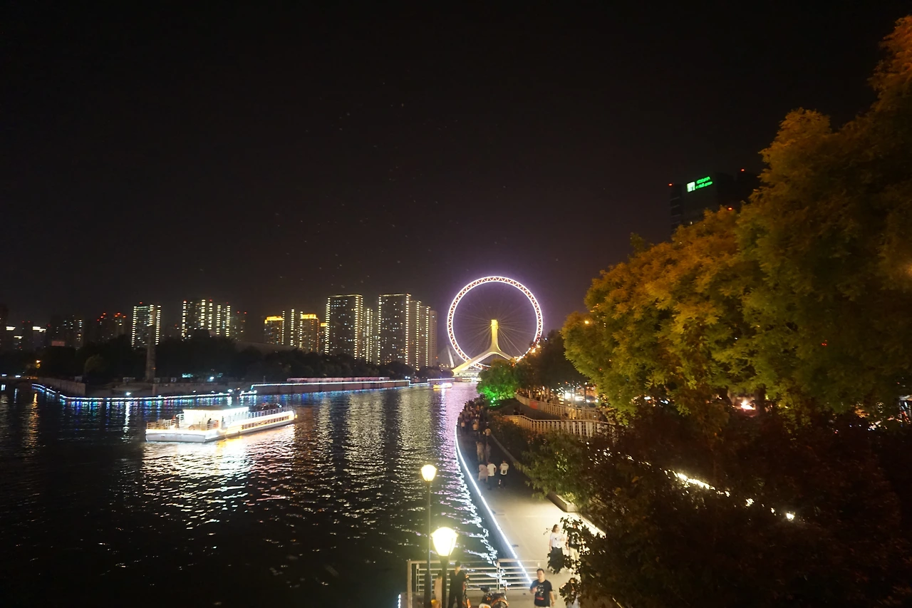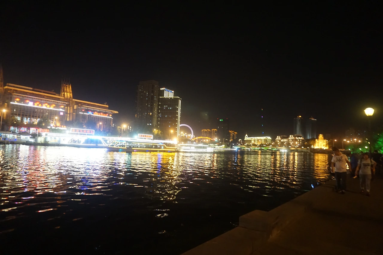 어두운 밤이 찾아왔고 우리는 이탈리아 풍경구를 나서 다시 하이허 강변으로 향했다. '톈진의 눈(天津之眼)'이라는 관람차의 야경이 예쁘다는 이야기를 들었기 때문이다. 다시 풍경구의 입구를 나와 앞서 지나온 다리 근처로 가는데 다리를 장식하고 있던 기둥과 동상들에 모두 밝은 빛이 들어와 있는 모습이 보인다. 다리 주변에 광장이 있어서 그런지 많은 사람들이 강바람을 쐬며 저녁의 여유를 즐기고 있었다.