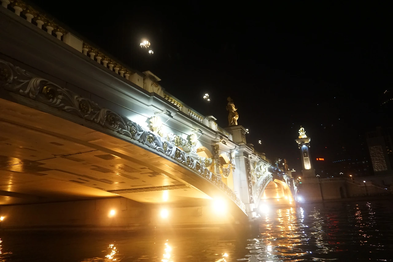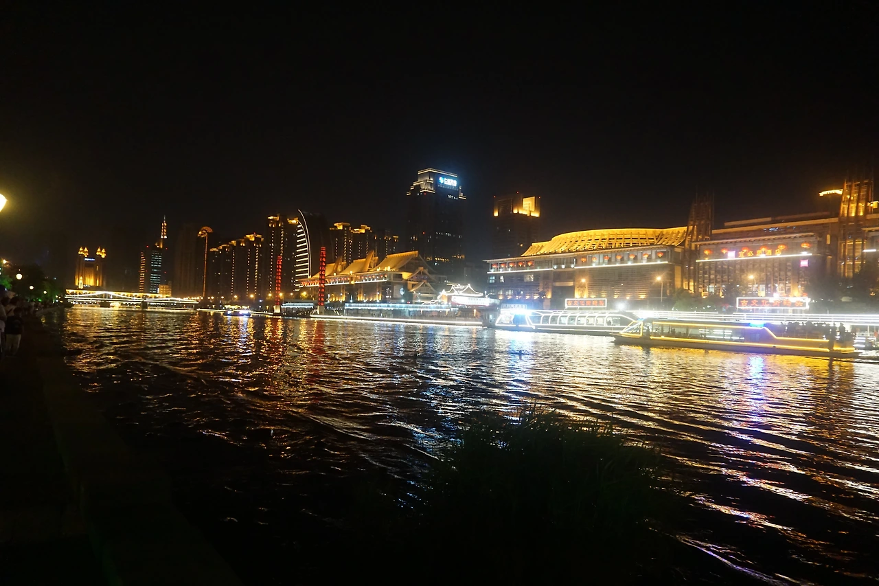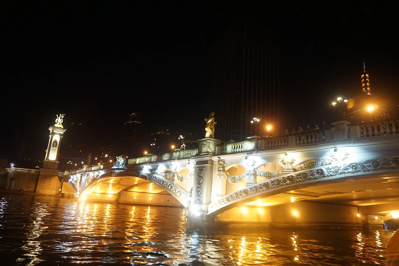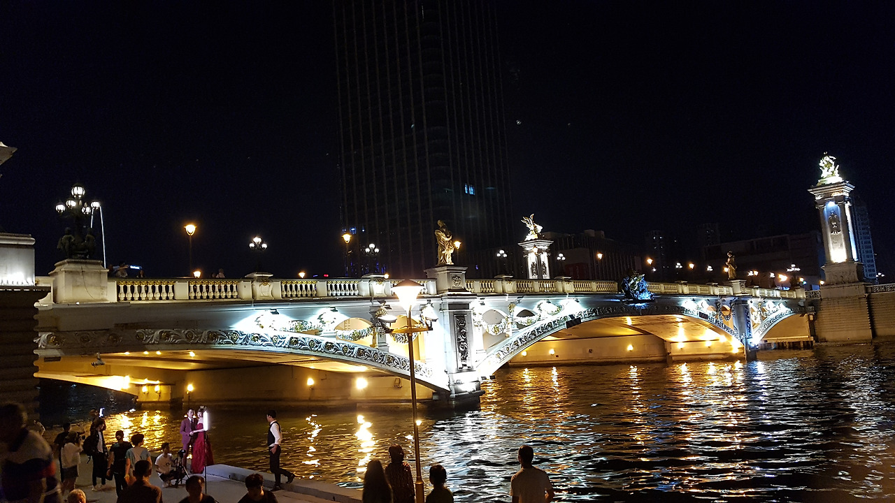 어두운 밤이 찾아왔고 우리는 이탈리아 풍경구를 나서 다시 하이허 강변으로 향했다. '톈진의 눈(天津之眼)'이라는 관람차의 야경이 예쁘다는 이야기를 들었기 때문이다. 다시 풍경구의 입구를 나와 앞서 지나온 다리 근처로 가는데 다리를 장식하고 있던 기둥과 동상들에 모두 밝은 빛이 들어와 있는 모습이 보인다. 다리 주변에 광장이 있어서 그런지 많은 사람들이 강바람을 쐬며 저녁의 여유를 즐기고 있었다.