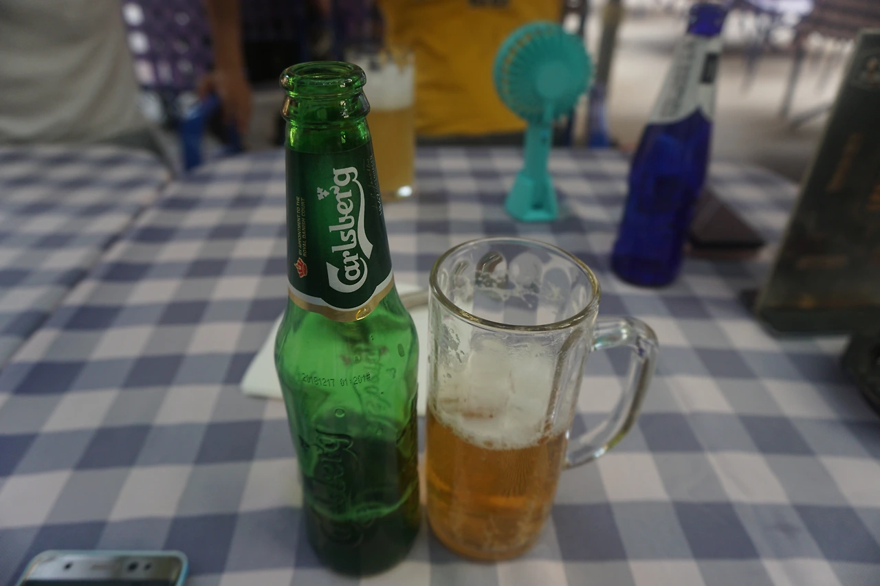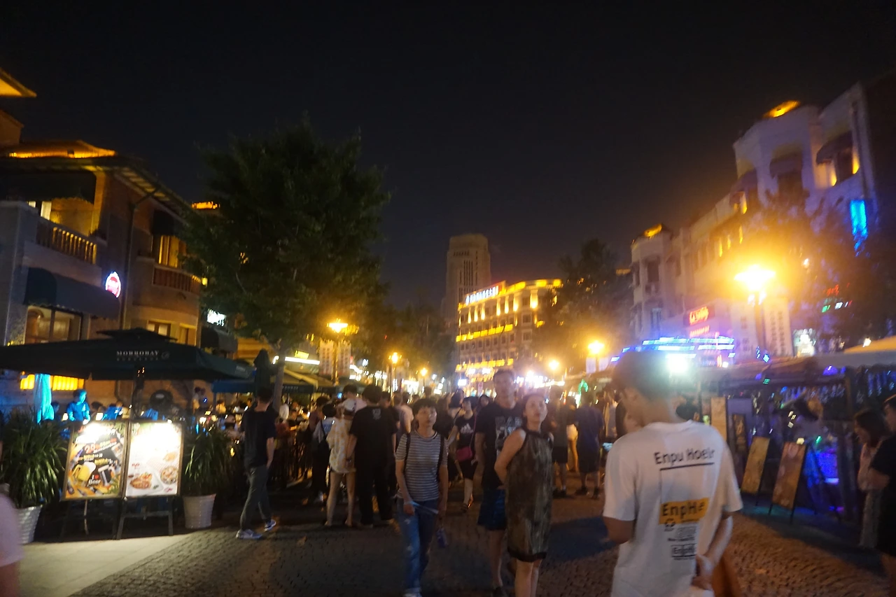 <시네마 천국>의 팬이 만든 것은 아닌지 의심되는 '신' 천당 영화관(新天堂电影院, 영화 <시네마 천국>의 중국어 제목이 천당 영화관이다)과 사자가 장식된 분수를 지나는데 음악 소리가 들려온다. 주변을 둘러보니 야외 좌석이 있는 맥주집이었는데, 라이브 무대를 하고 있는 가수가 있었다. 목도 마르고 더운데 마침 잘 되었다 싶어 들어가 주변에 지나가는 사람들이 잘 보이는 야외 자리에 앉았다. 칼스버그 한 병을 시켜 맛보는 맥주의 맛이란! 라이브 노래로는 린이롄(林忆莲)의 "지소환유니(至少还有你)"가 흘러나오고, 더위도 식힐 겸 잠시 여유를 즐겨본다.