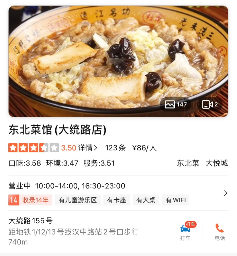 멋진 하늘도 봤겠다, 친구와 맛있는 것을 먹기로 했다. 메뉴는 철저히 나 위주인 동베이 음식(东北菜). 친구는 상하이 토박이지만 워낙 착해서 내가 고른 거면 다 좋단다. 그래서 급하게 따중뎬핑에서 그나마 평이 괜찮은 편이었던 동북 요릿집에 가게 되었다. 14년이나 수록된 나름 오래된 가게인데 전체 평점은 그다지 좋지 않다. 그래도 주변에 다른 대안이 없었기에 일단 가보도록 한다.