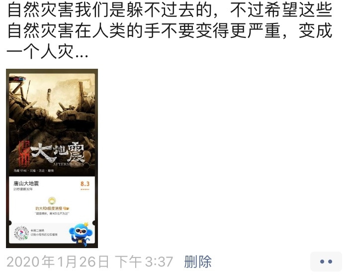 거대한 자연재해 앞에서 인간은 얼마나 미미한 존재인지, 그럼에도 불구하고 그 영향을 최소화해 그 여진을 줄이려면 어떻게 해야 하는지를 생각하게 하는 영화, <당산대지진(唐山大地震)>이었습니다. 그럼, 마지막으로 영화를 보고 위챗에 올렸던 감상문을 공유하며 인사드리겠습니다.