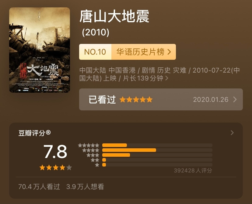 줄거리를 자세하게 쓰면 자칫 영화의 감동이 반감될 수 있으니 자세히 적진 않겠습니다만, 사실 이 영화는 재난 영화라기보다는 오히려 가족 간의 사랑과 유대를 다루는 영화라고 봐야 할 것 같습니다. 지진은 하나의 연결고리로서 작용할 뿐입니다. 물론 초반의 탕산 대지진은 너무 현실감 있게 다가와 보기 좀 힘들긴 합니다만. 개봉 당시 이 영화는 중국 최초 IMAX 영화였다고 하는데, 지진 장면이 꽤나 처참하고 현실적이라 저라면 그냥 일반 상영관에서 봤을 것 같아요.
