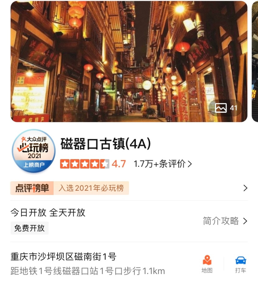 역사적인 배경은 이렇지만, 냉정하게 말해 츠치커우에 입점해 있는 점포의 느낌은 상하이에 있는 주가각(朱家角)이나 톈진에 있는 고문화 거리(古文化街)와 크게 다르지 않기 때문에, 다른 지역의 비슷한 거리를 많이 가봤다면 실망할 수도 있다. 내 생각엔 이런 곳에서 뭔가 거리 자체의 특색을 찾는 것보다는 오히려 충칭이라는 지역에 위치함으로써 다른 지역과 구별되는 차이를 주로 보는 것이 더 적절한 것 같다.