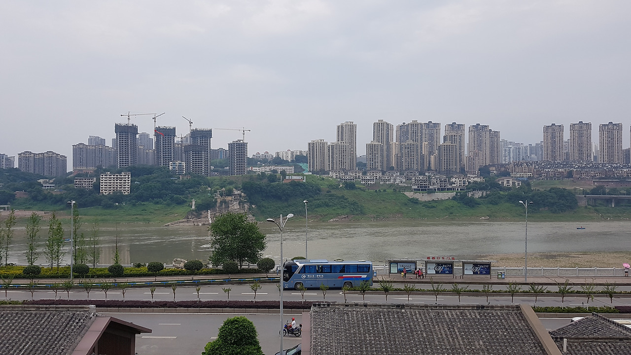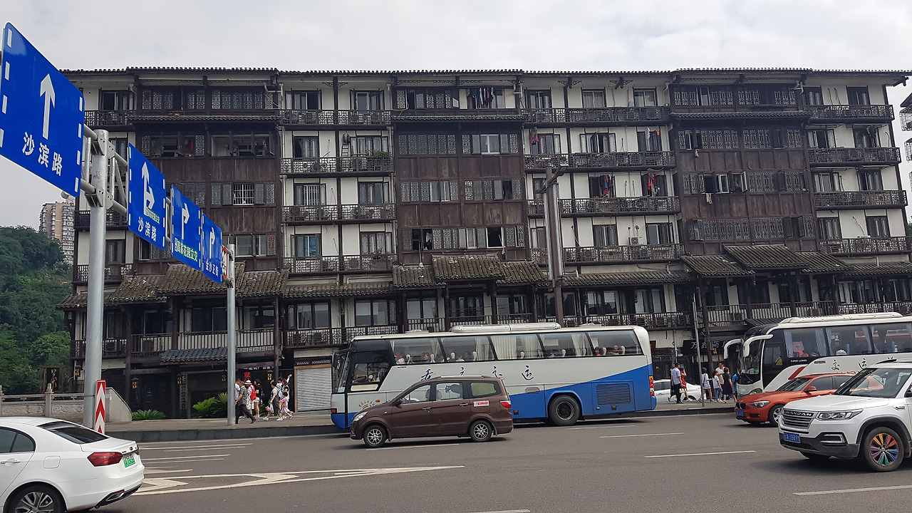 밥을 다 먹고 쇼핑몰 바깥으로 나오는데, 장강 줄기인 쟈링강(嘉陵江) 물결이 눈앞에 흘러간다. 쇼핑몰 자체가 강변에 위치해 있어서 이렇게 강 풍경이 그대로 보이는 것이다. 큰길로 나오니 아래 오른쪽 사진처럼 웬 일제시대 다다미방 같은 느낌의 건물들이 보인다. 방금 전까지 현대적인 쇼핑몰의 모습만 보다가 갑자기 이런 구시가지의 모습이 눈에 들어오니 타임머신을 타고 과거로 온 것 같은 느낌이 든다. 그리고, 저 다다미방 같이 보이는 곳이 바로 우리가 곧 가게 될 츠치커우(磁器口) 고진이다.
