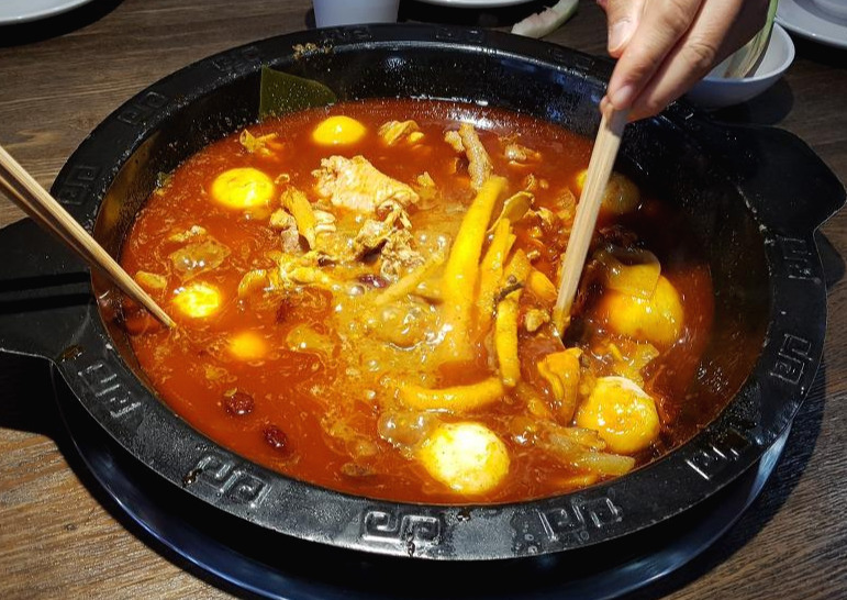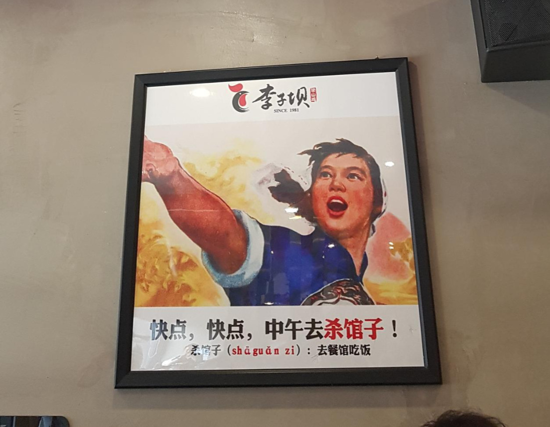 식당 내부는 약간 대약진 운동할 때쯤의 복고풍 인테리어로 여기저기 구호 같은 것들이 붙어 있었는데, 특히 충칭 사투리로 적힌 포스터가 눈에 띄었다. 식당의 대표 요리인 량샨지(梁山鸡)를 시켰는데, 닭이 한 마리 통째로, 그러니까 닭발까지 다 들어있다는 것과 감자가 아닌 토란이 들어가 있다는 점, 한약재가 생각보다 많이 들어가 있다는 점은 닭볶음탕과 달랐지만 그래도 매콤한 맛 베이스라서 한국 요리를 먹는 것 같은 느낌도 들었다. 훠궈도 좋아하고 닭도 좋아하는 사람이라면 얼마든지 즐길 수 있는 맛이다.