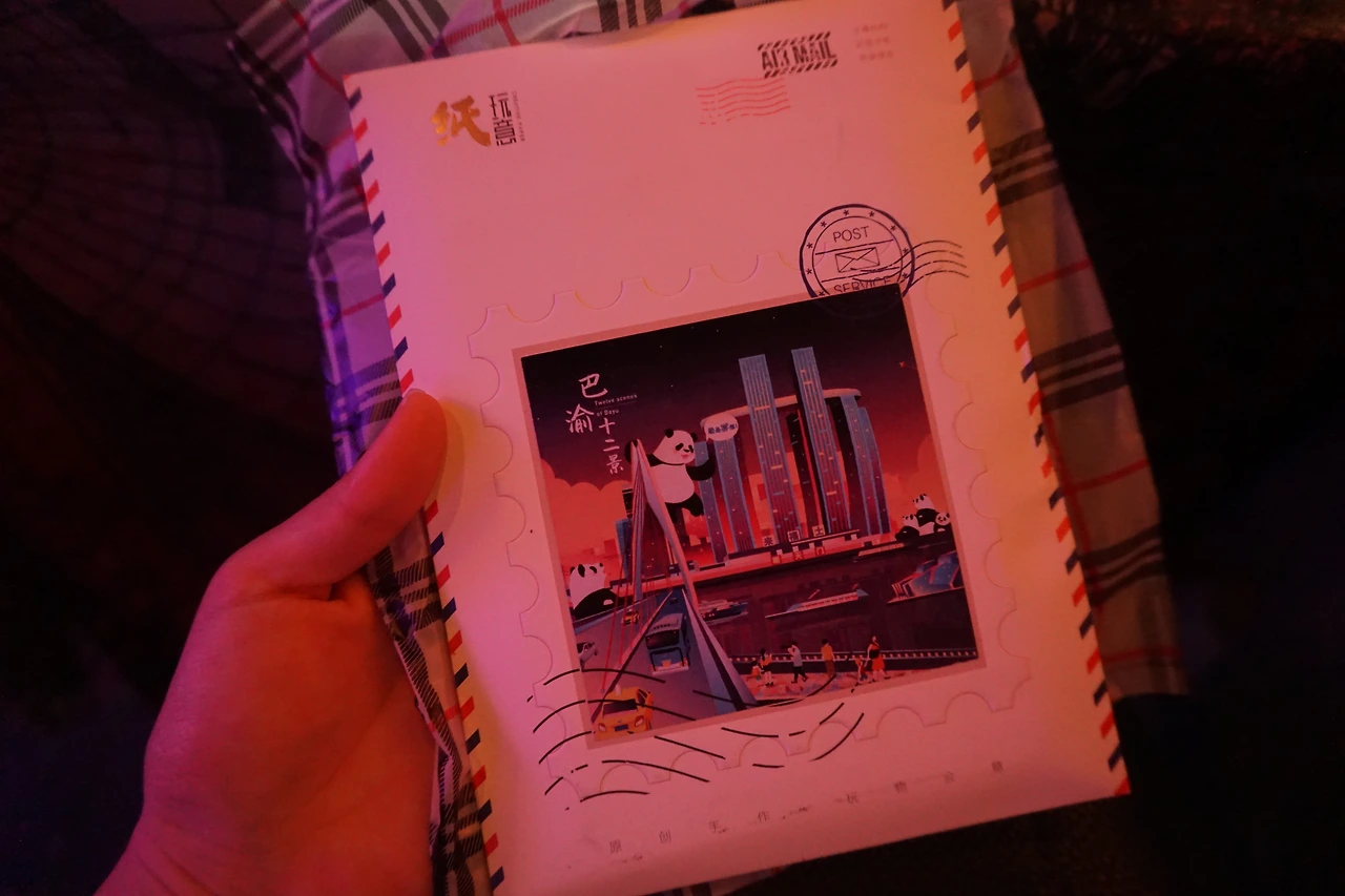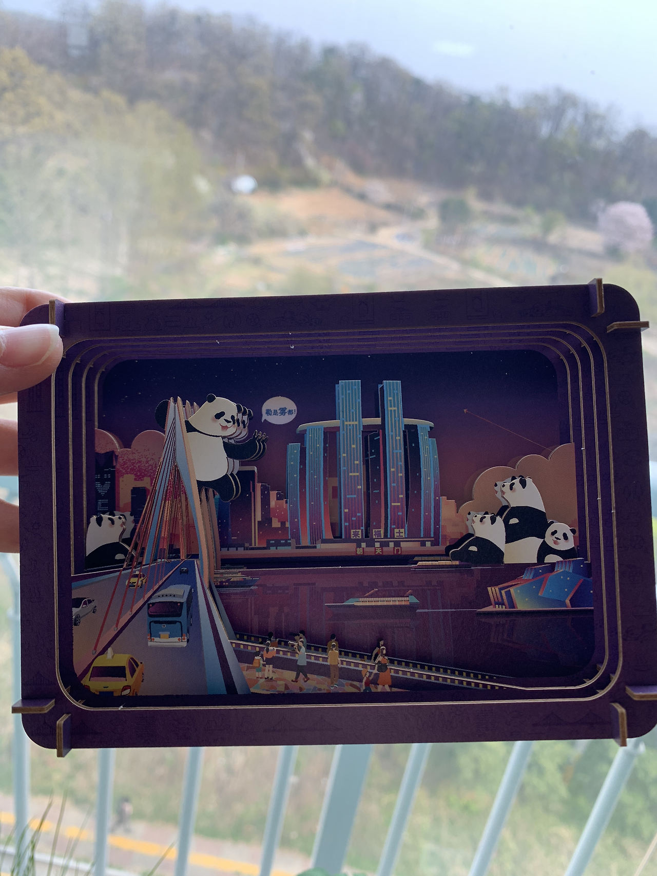 디자인이 마음에 들었다. 바로 전날 저녁에 야경을 보고 온 쳰쓰먼대교의 풍경이었다. 하드보드지에 A-AB-ABC-ABCD 이렇게 점층적으로 늘어나는 도안이 그려져 있었는데, 이것을 잘 세워서 연결해주면 바로 완성되는 종이퍼즐이었다. 팬더가 다리 위를 잡고 서서 "러스우두(勒是雾都, 충칭 방언으로 '여기는 충칭'이라는 뜻)"라고 말하는 것까지 완벽했다.