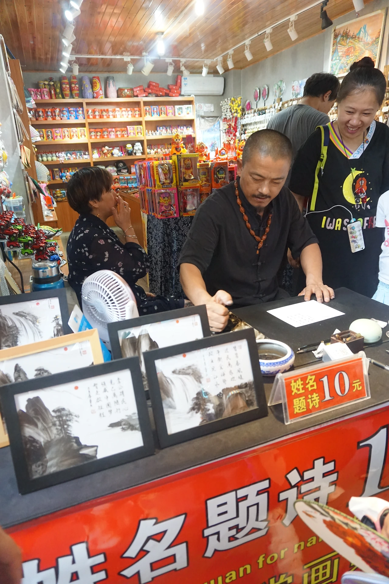 오른쪽 사진은 개인적으로 인상적이었던 '이름으로 시 짓기' 상점. 말 그대로 이름에 들어가는 한자를 적어주면 그 한자를 가지고 시를 지어주는 상점이었다. 건당 10 위안밖에 받지 않아서 사실 해보고 싶은 마음도 있었지만, 아무래도 한국인 이름에 들어가는 한자는 중국에선 잘 쓰지 않는 한자인 경우가 많아 괜히 시인을 곤란하게 만들까 싶어 주문은 하지 않았다. 우리나라로 치면 이름으로 삼행시 지어주기 정도일까? 역시 한시가 생활화되어 있는 중국이다.