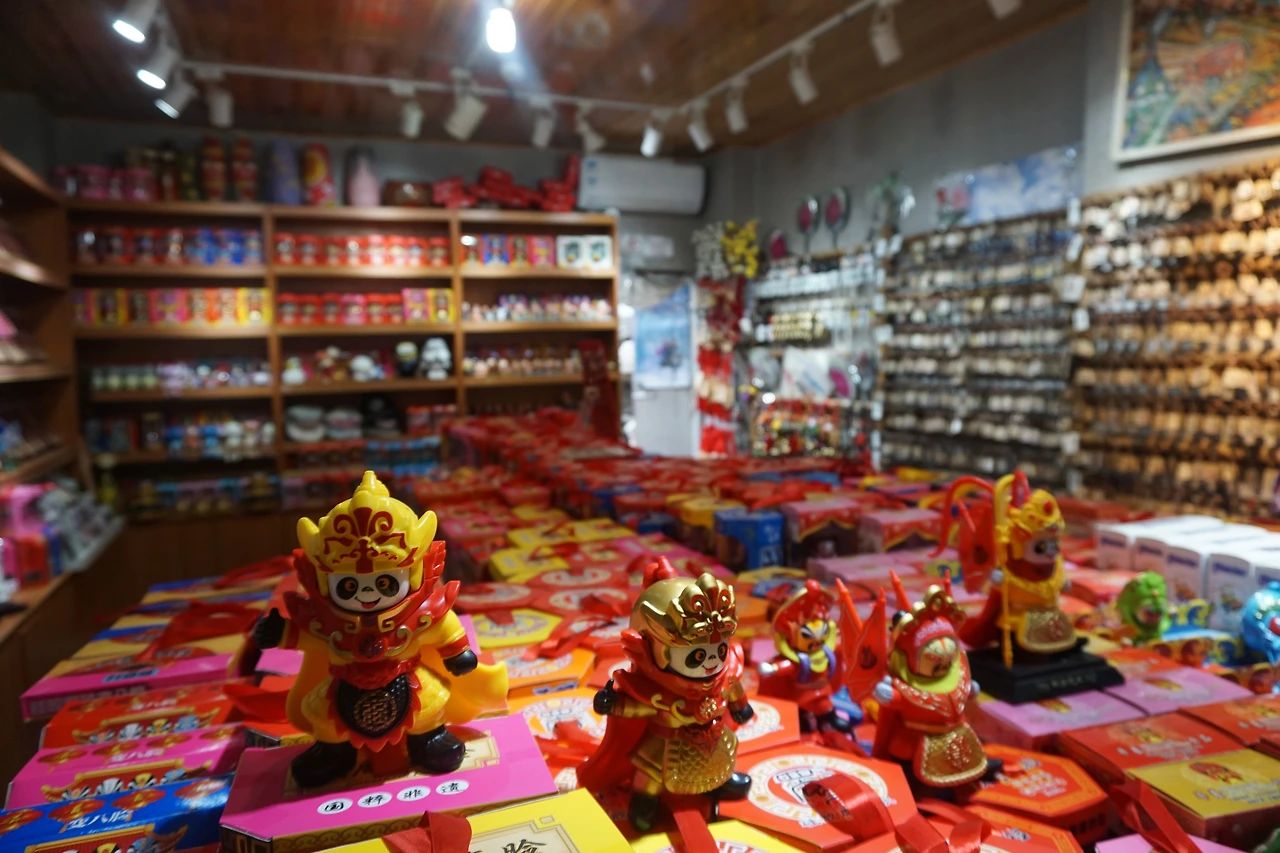 상단 왼쪽 사진은 역시 청두에서도 많이 보였던 변검 장난감이다. 머리 장식을 아래로 누르면 딸깍 소리가 나면서 팬더 얼굴의 색이 변했다. 디자인도 다양하고 값도 저렴해서 많이들 사갔다. 하지만 싼 게 비지떡이라고 잘 고장난다고 하더라.