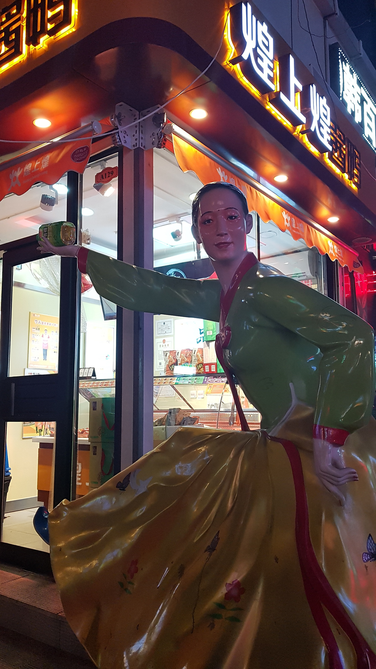 #3. 식당 앞을 장식해둔 한복 입은 사람 모형. 아마도 조선족 전통 복장이라고 한복을 입힌 모양을 세워둔 것 같다. 사실 내가 사진을 찍게 된 이유는 따로 있는데, 그녀의 오른손에 들려 있는 음료. 저건 원래 있던 게 아니라 누군가 올려놓은 것이다. 가끔 이렇게 중국인들의 해학(?)을 발견할 때마다 나도 모르게 웃음이 지어진다.