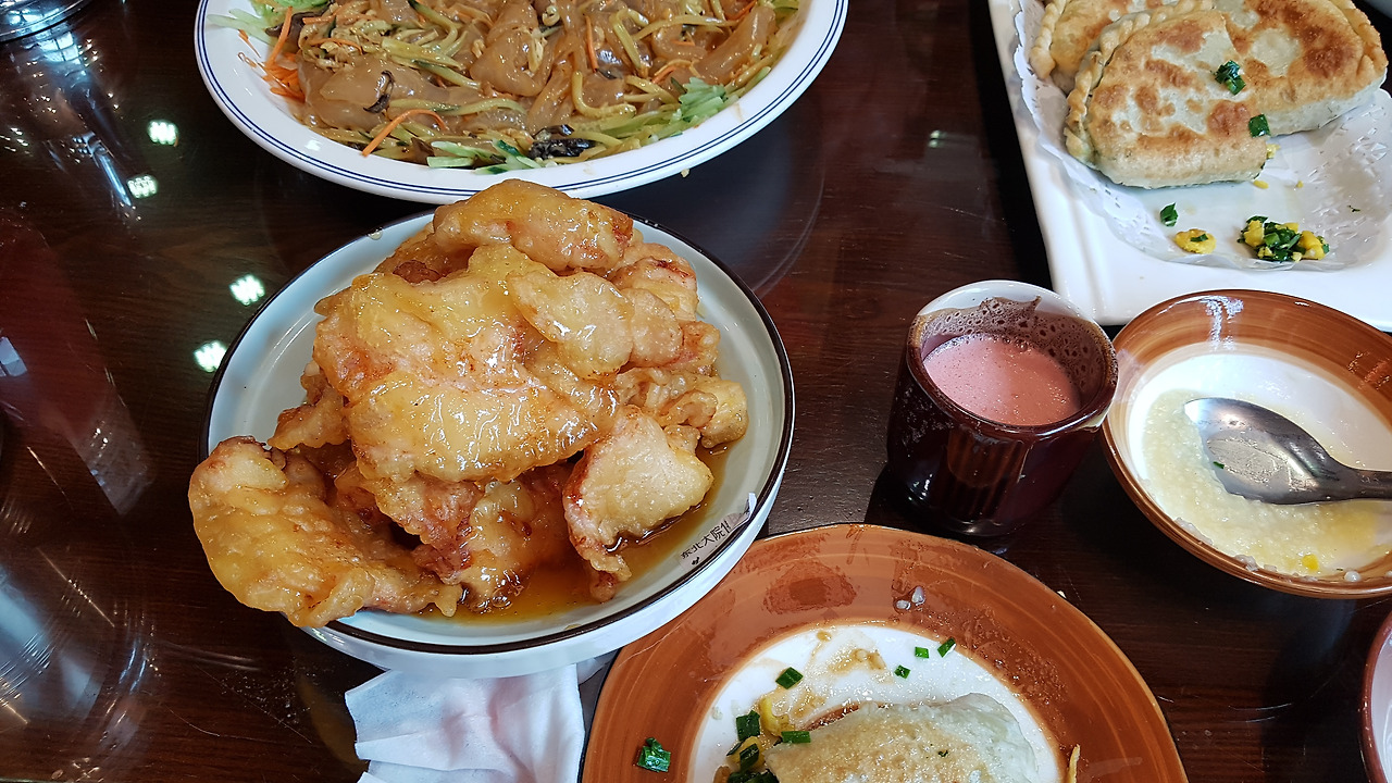 삭힌 오리알과 두부를 간장소스와 함께 버무려낸 피딴더우푸(皮蛋豆腐), 부추와 계란을 속에 넣은 대형 군만두 쥬차이허즈(韭菜盒子), 넓적 당면을 각종 야채와 특제 겨자소스에 버무려 나오는 동북 라피(拉皮), 동북 요리에 빠질 수 없는 꿔바오러우(锅包肉), 한국이면 고급 중국식당에나 있을 법한 전가복(全家福), 그리고 갈증을 풀어줄 수박주스까지. 시킨 메뉴들은 다 동북 요리에서 순위권 안에 들어갈 메뉴들. 다만 그 음식이 담긴 접시가 정말 엄청나게 크고 접시만 큰 게 아니라 요리의 양까지 많아서 보기만 해도 배가 부를 정도였다.