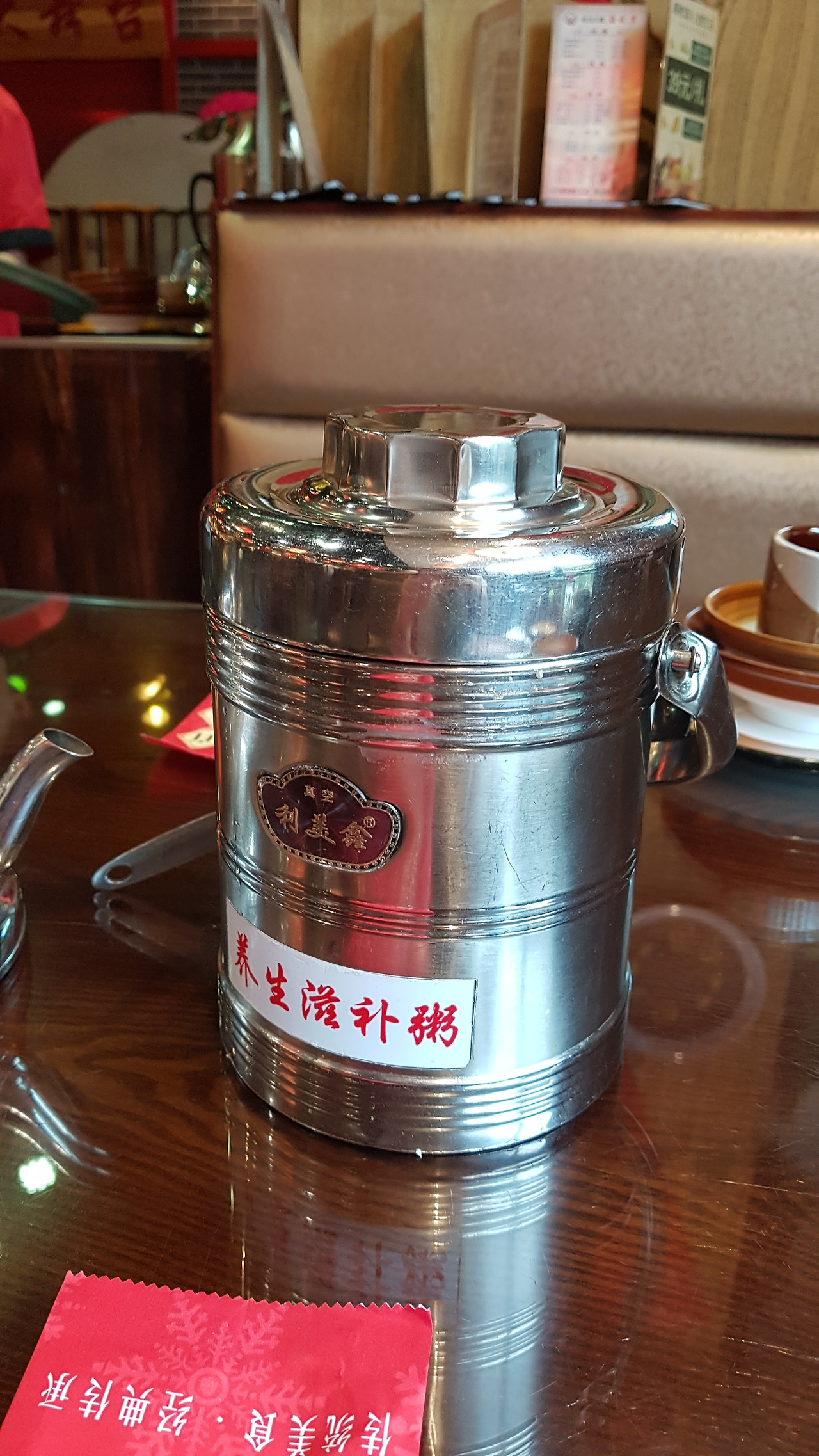 또 한 가지 특이했던 점은 테이블마다 아래 오른쪽 사진과 같은 큰 통이 하나씩 놓여있었다는 점이다. 양생자보죽(养生滋补粥)이라고 적혀있는 이 통은 호로록호로록 마실 수 있을 만큼 묽은 죽이었다. 어떤 요리를 주문하는지에 관계없이 무료로 제공되는 죽이었다. 북방 지방의 인심을 볼 수 있는 동시에 '죽을 마신다(喝粥)'는 말이 일상적인 이곳 중국 사람들의 식문화를 보여주는 모습이었다.
