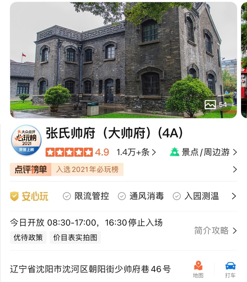 이곳은 동북지방 군벌 출신이던 장쭤린(张作霖)과 그의 아들 장쉐량(张学良)이 살던 집으로, 다른 이름으로는 대수부(大帅府)라고 불린다. 수(帅)라는 글자가 중국어에서 '멋있다'라는 형용사 외에도, '장군'이라는 의미가 있으니 '대장군의 저택'이라는 뜻이라고 할 수 있다. 하지만 재미있는 건, 사실 이 두 사람이 '장군'으로서 역할을 했던 곳은 공산당이 아니라 국민당, 중화민국이라는 사실이다.