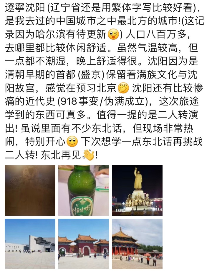 (譯) 랴오닝 선양(랴오닝성은 번체자로 쓰는 게 확실히 예쁘다), 은 내가 가본 중국 도시들 중 가장 북쪽에 위치한 도시였다. (이 기록은 하얼빈을 다녀오고 나면 깨질 것이다.) 인구 8백여만 명, 어디를 가든 한적하고 편안했던. 기온이 꽤 높았지만 하나도 습하지 않아서 밤에는 정말 쾌적했다. 선양은 청나라 초기의 수도(성경)였기 때문에 만주족 문화와 선양 고궁을 간직하고 있었는데, 마치 베이징을 예습하는 기분마저 들었다. 선양은 또한 9·18 사변이나 위만주국 성립 등 비통한 근대사 역시 가진 도시다. 이번 여정에서 꽤나 많은 것들을 배울 수 있었다. 얼런쫜 공연도 빼놓을 수 없다. 공연 중 동베이 사투리도 꽤 많이 있어서 알아듣기 어려웠지만, 분위기가 정말 뜨거웠고 보는 내내 즐거웠다. 다음엔 동베이 사투리를 좀 배운 뒤에 다시 보러 가고 싶다. 동베이 안녕!