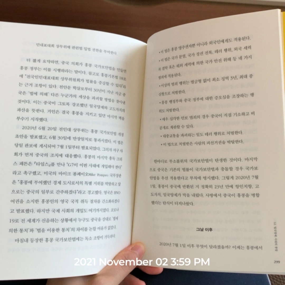 몇 달 전, 넷플릭스를 통해 조슈아 웡의 우산혁명에 대한 다큐멘터리를 보고 굉장한 충격을 받은 일이 있다. 사실 19년 중국에 있을 때, 본래 비자 트립을 위해 홍콩을 가야했는데 시위가 격화되어 대만으로 목적지를 바꿨던 일이 있는데, 그때만 해도 홍콩의 상황을 구체적으로 알지 못했다. 대부분의 사람들이 그렇듯, 자신의 몸으로 겪지 않은 일에는 둔감해질 수밖에 없기에. 하물며 나는 홍콩에 가본 적이 없으니 더더욱. 혹시 나처럼 우산혁명을 통해서 홍콩을 접한 사람에겐 이 책이 꽤나 도움이 될 것 같다. 홍콩이라는 땅이 어떻게 지금의 모습을 갖게 되었으며, 그들은 무엇을 위해 싸우고 있는지를 이 책을 보면 잘 알 수 있다. 누군가 홍콩에 대해 궁금해하면 나는 이 책을 추천할 듯하다.
