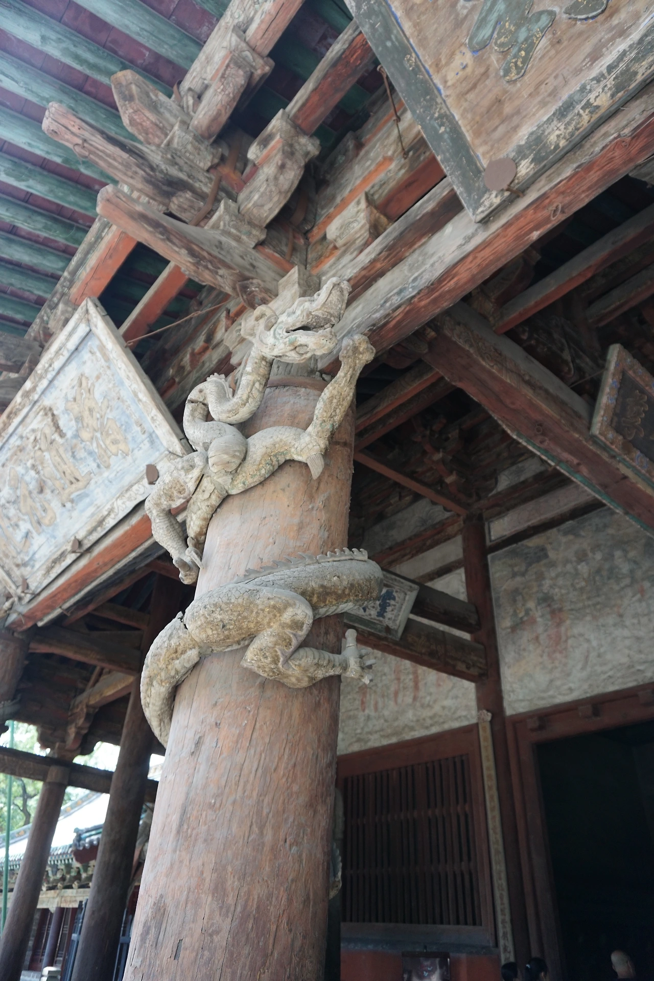 이 건물엔 특이한 점이 두 가지 있는데, 우선 건물 내부에는 기둥이 따로 없고 건물을 둘러싼 회랑과 처마의 기둥만이 건물을 받치고 있다는 점이다. 건물이 만들어진 연도를 생각하면 신비한 부분이다. 또한 건물 정면 기둥에 새겨진 반룡도 신기하다. 중국에서 가장 오래된 목조 반룡 작품이자 중국 최초로 나무기둥에 조각된 용이라는 이 작품은 가까이서 보면 꽤나 생동감 있어 건물의 고풍스러움을 더한다. '성모'를 신성하게 모시려는 후대의 마음이 느껴진다.