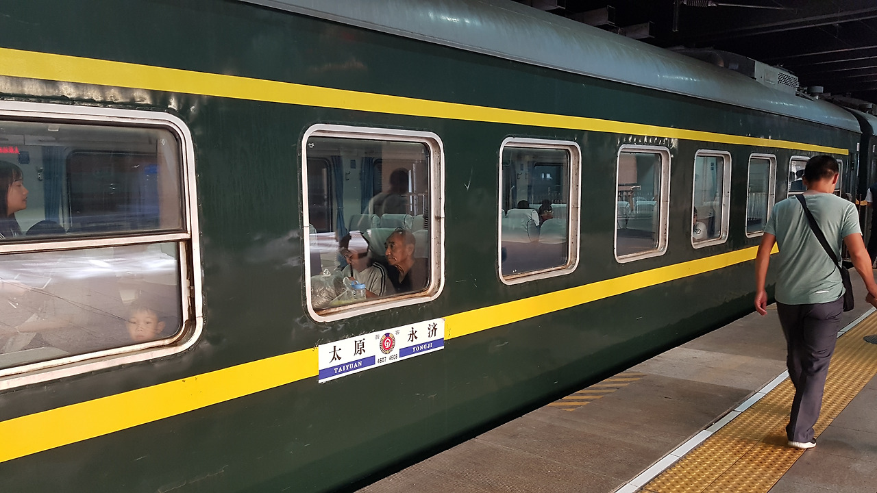 타이위안을 출발하여 용지(永济)라는 이름의 처음 들어본 도시로 가는 이 열차. 찾아보니 용지는 산시성(山西省)과 또 다른 산시성(陕西省) 경계에 있는 도시란다. 기차편 이름에 다른 알파벳이 붙어 있지 않아 생경하다 싶었는데(고속철 등 특수 열차는 기차 편명 앞에 G, D 등 알파벳이 하나씩 붙어 있다), 이 기차는 지금까지 지역연구를 위해 타본 다른 기차들과도 전혀 다른 모습을 가졌다. 겉이 온통 초록색으로 칠해져 있어 초록 껍데기 기차(绿皮车)라는 이름으로 불리는 이 기차는 가장 속도가 느리고 값이 싼 축에 속하는 일반 기차다. 작은 도시 위주로 구석구석 다니는 기차여서 그런지 기차 밖 풍경도 정말 시골 풍경이다. 중국인들에겐 이런 초록 기차가 나름의 향수를 불러일으키는 모양인지 위챗에 사진을 올리니 친구들의 반응이 뜨겁다.
