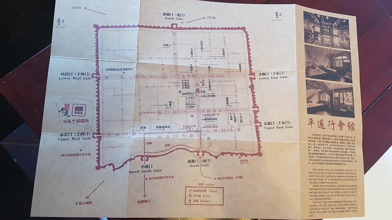 프런트에서 체크인을 할 때 아래와 같은 지도를 하나 줬다. 크래프트지 같은 황토색 종이로 되어 있는 이 지도에는 고성에서 가볼 만한 곳과 주요 출입구들이 표시되어 있었고, 이곳 객잔과 관련된 설명도 적혀 있었다. 청대 핑야오에서 유명한 부호의 집이었다는 이 객잔은 내가 묵을 당시 기준, 고성 안에서는 유일하게 5성급 숙소였다. 전체적으로 친절하고 고즈넉해서 원했던 분위기였던 기억이다.