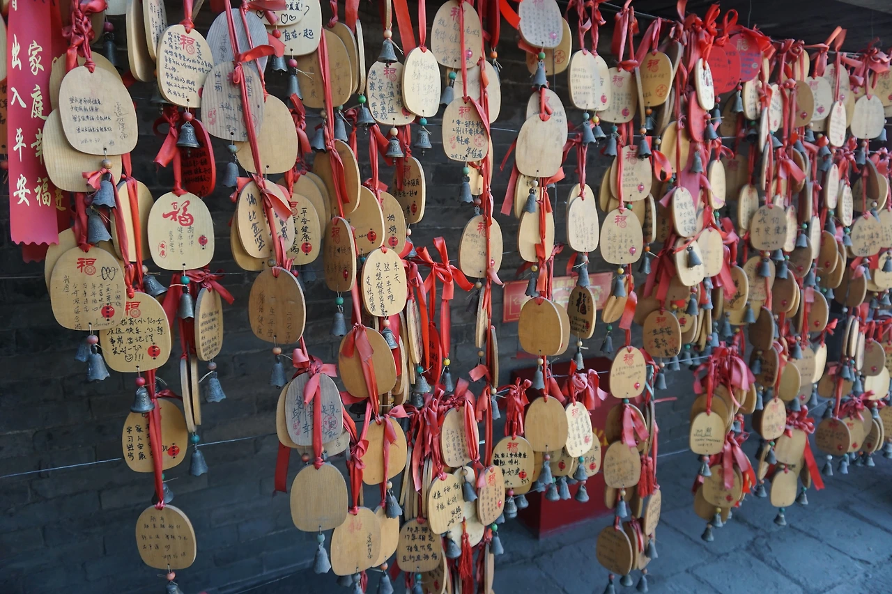 그리고 또 성황묘(城隍庙) 역시 이곳이 옛 도시였다는 사실을 보여준다. 마을을 지키는 신인 성황신을 모신다 하여 옛날엔 마을마다 성황묘가 하나씩 있었다고 하는데, 이곳 핑야오고성에서 볼 수 있는 성황묘 역시 옛날에 세워졌던 모습 그대로를 보존하고 있었다. 특히 그 안에 사람들이 기원을 담아 걸어둔 기원패들과 연못에 던져진 엽전들이 인상적이었다.