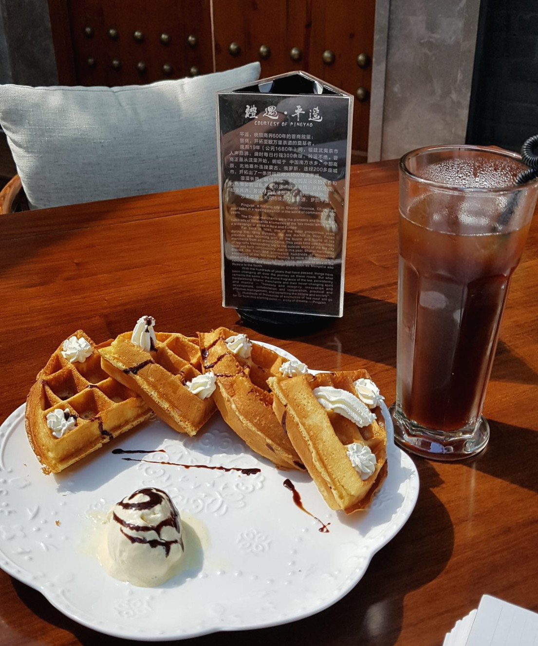 구경은 열심히 하고 있는데, 너무 덥다. 저녁을 먹기에는 시간이 또 어중간하게 남은 상황. 이럴 땐 일단 보이는 아무 카페나 들어가 보는 것이 자유 여행의 매력! 내가 찾은 카페는 '핑야오를 만나다(遇见平遥)'라는 이름의 카페였다. 너무 더워서 일정도 좀 점검할 겸 노트를 펴고 앉았다. 커피 한 잔과 아이스크림 와플을 시켰는데 기온이 너무 높아 아이스크림이 이미 반절 정도가 녹은 상태. 그마저도 감지덕지라고 생각하며 먹는다. 큰 기대를 하지 않아서일까. 달콤하고 맛있다. 여기서 시간을 좀 보내다 저녁을 먹으러 가야겠다.