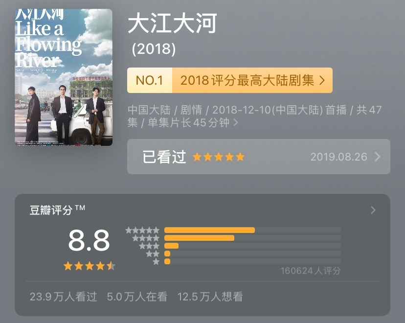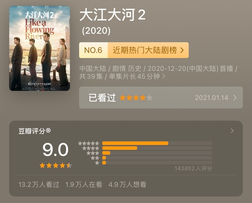 오늘 소개해드릴 드라마는 <환락송(欢乐颂)>과 같은 제작사인 정오양광(正午阳光)에서 제작한 당대(当代)극, <대강대하(大江大河)>입니다. 2018년 12월에 방영을 시작한 작품인데, 2019년 1분기 중국에서 가장 화제가 되었던 드라마라고 해도 과언이 아닙니다. 또한 시즌 1이 나온 지 2년이 지난 2020년 12월, 시즌 2도 방영이 되었고, 시즌 2 역시 주선율(主旋律, 공산당 및 중국 체제 찬양 스토리를 말함)의 교과서라는 말을 들을 정도로 평이 좋았습니다.