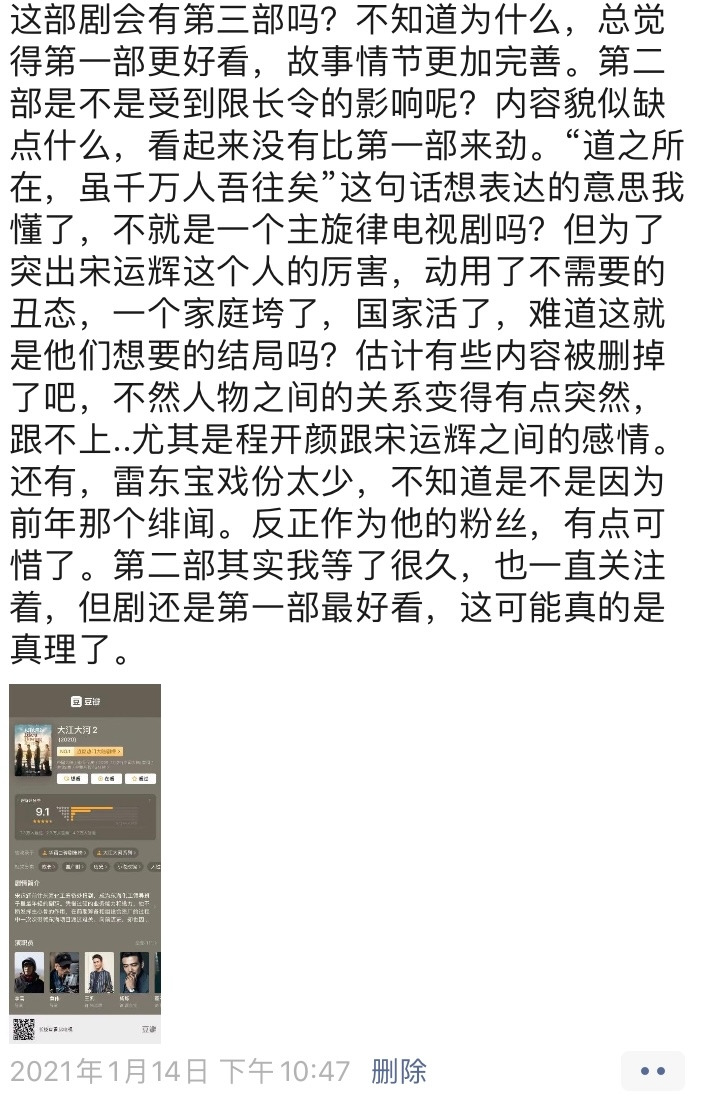 (2021.01.14 시즌 2를 보고) 이 드라마, 정말 시즌 3이 나오는 걸까? 왠진 모르겠지만 시즌 1이 더 재밌었던 것 같고, 스토리 전개도 좀 덜 허술했던 것 같다. 시즌 2 혹시 길이 제한의 영향을 받은 건 아닐까? 내용이 좀 빈 느낌이라 시즌 1 때보다 몰입감이 덜했다. "그 길이 맞다면, 천만명이 내 앞에 있어도 나는 뚫고 가겠다", 이 말이 표현하고 싶은 것이 뭔지는 알았다. 그냥 주선율 드라마일 뿐이잖아. 하지만 송윈후이(宋运辉) 한 사람의 훌륭함을 돋보이게 하기 위해서, 불필요한 치부들을 너무 많이 드러낸 것 같다. 한 가정이 무너졌는데 국가는 살고, 정말 이것이 그들이 바라는 결말인가? 내용 일부가 편집 중에 삭제되어서 그런지는 모르겠지만, 인물들 간의 관계가 너무 갑자기 변해서 따라가기가 힘들었다. 특히 청카이옌(程开眼)과 송윈후이(宋运辉) 사이의 감정의 변화. 그리고 레이동바오(雷东宝) 분량이 너무 적었다. 혹시 몇 년 전 그 스캔들 때문이었을까? 아무튼 그의 팬으로서, 조금 아쉬웠다. 사실 시즌 2를 꽤 오래 기다렸고, 계속 관심을 갖고 지켜보고 있었는데, 역시 속편은 재미없다는 말이 맞나 보다.