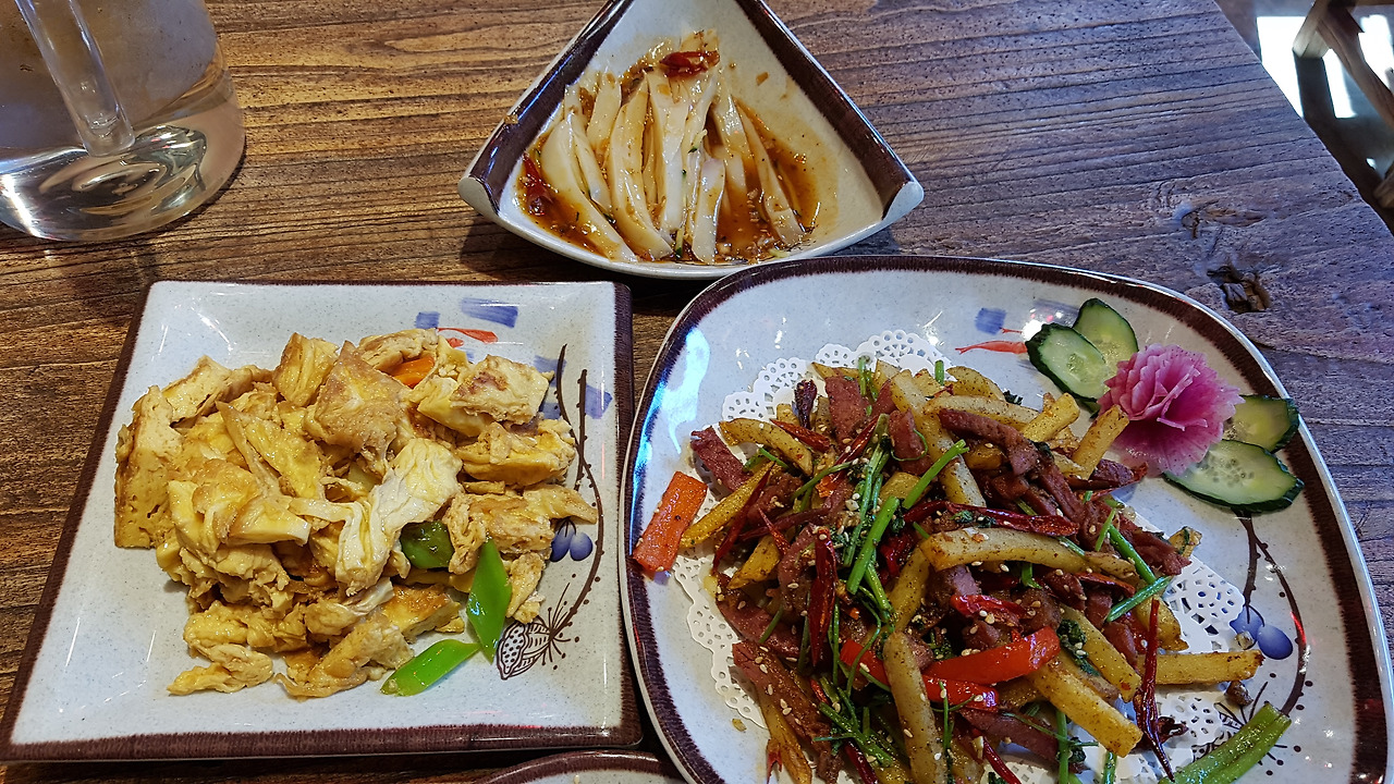 핑야오 고성은 산시(山西)성에 속해 있는데, 산시성의 특산물인 식초(陈醋) 외에도 핑야오 소고기(平遥牛肉)가 유명하다. 내가 들어간 식당은 주로 이 재료들을 사용한 요리를 파는 곳이었다. 나는 감자채소고기볶음(土豆条牛肉)과 식초계란볶음(香醋鸡蛋), 그리고 완퉈(碗托)라는 요리를 시켰다. 첫 번째 요리는 핑야오의 소고기, 두 번째 요리는 핑야오의 식초, 그리고 마지막 요리는 핑야오 특색 분식(小吃)이라 하여 시킨 것이다. 그리 붐빌 시간이 아니어서 그랬는지, 아니면 딱 봐도 여행객인 내가 안쓰러워 보였는지, 식당 주인분이 직접 등판하셔서 메뉴 소개를 해주신 덕에 엑기스 메뉴만 딱 시킨 것 같다.