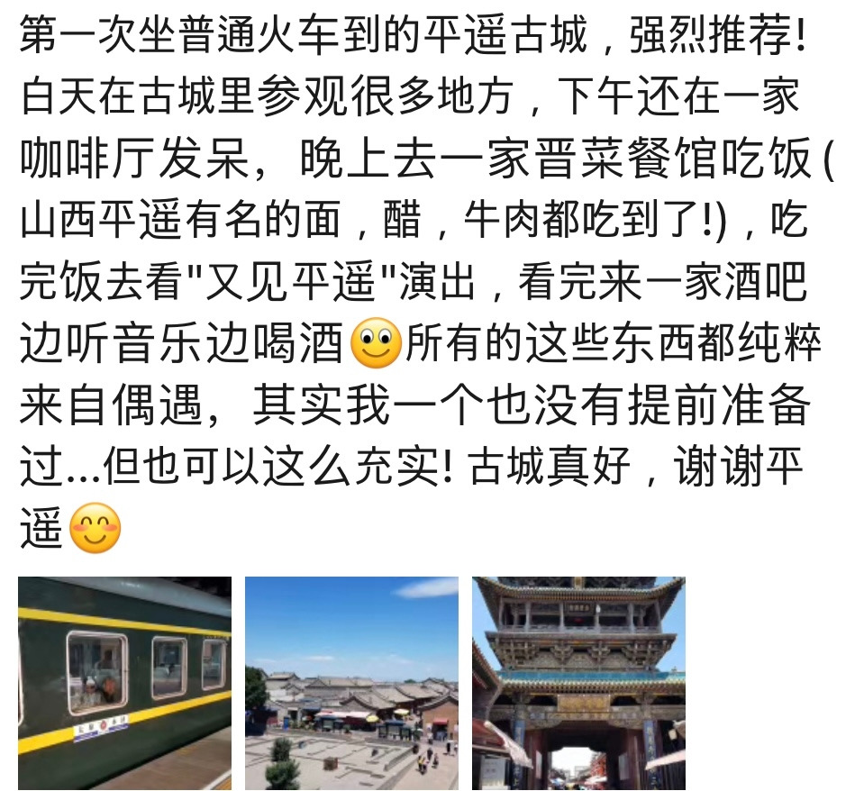 (譯) 처음으로 일반 열차를 타고 도착한 핑야오 고성, 강추! 낮에는 고성에서 여러 곳들을 둘러보고, 오후에는 한 카페에서 멍도 때려보고, 밤에는 산시성 음식점에서 밥도 먹고(산시 핑야오의 유명하다는 면, 식초, 소고기 모두 먹었다!), 밥 다 먹고 나서는 "요우졘핑야오" 공연도 보고, 공연 다 본 뒤에는 술집에서 음악을 들으며 술도 마시고..! 이 모든 것들이 모두 완전 우연히 만난 것들이라니..! 사실 이 중에 그 어떤 것도 내가 미리 계획한 게 없었다는 사실.. 하지만 그래도 이렇게 알차게 하루를 보낼 수 있었다! 고성 너무 좋다, 고마워 핑야오!