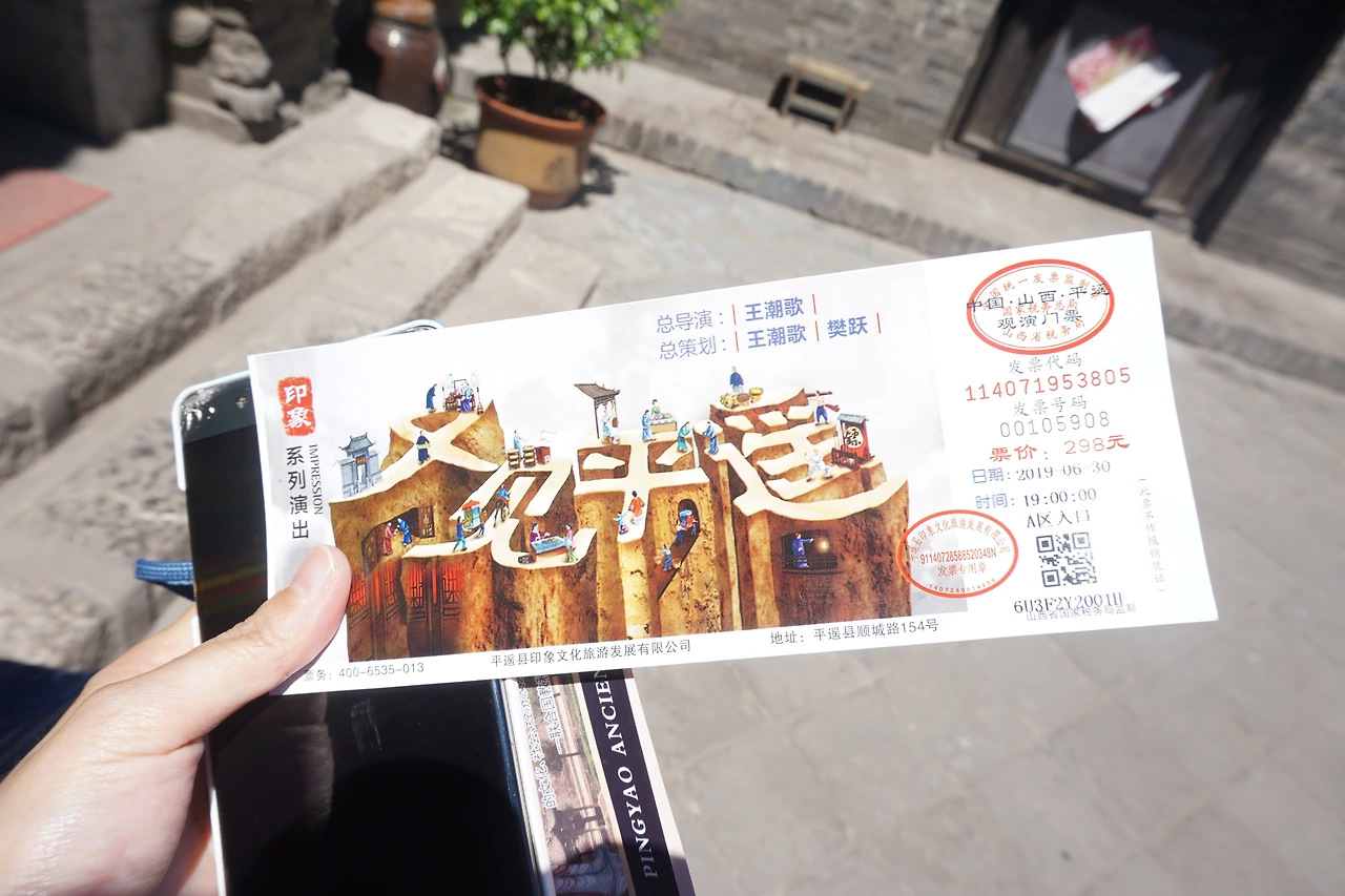 친절한 주인장의 식당에서 배를 채우고 나는 7시에 시작할 한 특별한 공연을 보러 갔다. 막 고성에 도착했을 때 숙소까지 데려다주던 기사님이 추천해준 바로 그 공연, <우견평요(又见平遥)>였다. 숙소로 들어가던 길에 C trip(携程) 어플로 예매를 했고, 고성을 구경하던 시간에 짬을 내어 실물표를 교환했다.