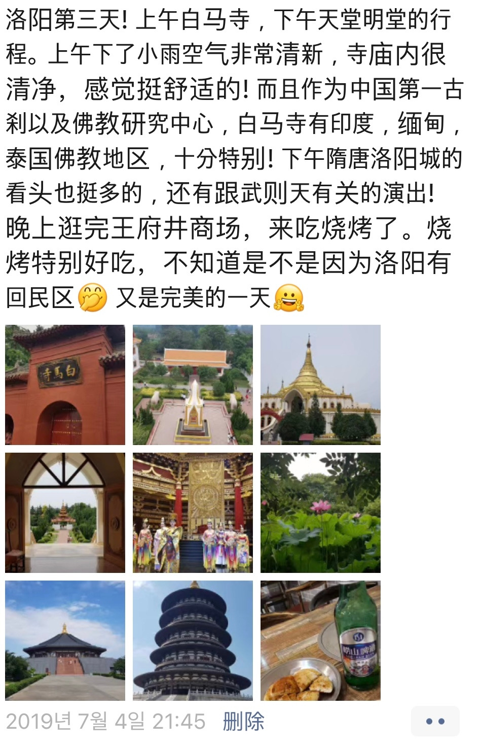 (譯) 뤄양에서 보내는 3번째 날! 오전에는 백마사, 오후에는 톈탕, 밍탕을 보는 일정이었다. 오전에 보슬비가 내려 공기가 무척 맑았고, 사원 안도 무척 조용했기에 돌아다니기 좋았다. 게다가 중국의 첫 절이자 불교연구센터로서, 백마사에는 인도, 미얀마, 태국 불교 구역이 있었던 점이 무척 특별했다. 오후 수당낙양성에서의 볼거리도 매우 많았다. 무측천과 관련된 공연도 있었다! 밤에는 왕푸징 쇼핑몰을 구경한 뒤 샤오카오를 먹으러 왔다. 샤오카오 정말 맛있었다. 뤄양에도 회족 지역이 있어서 그런 걸까? 오늘도 완벽한 하루였다~!