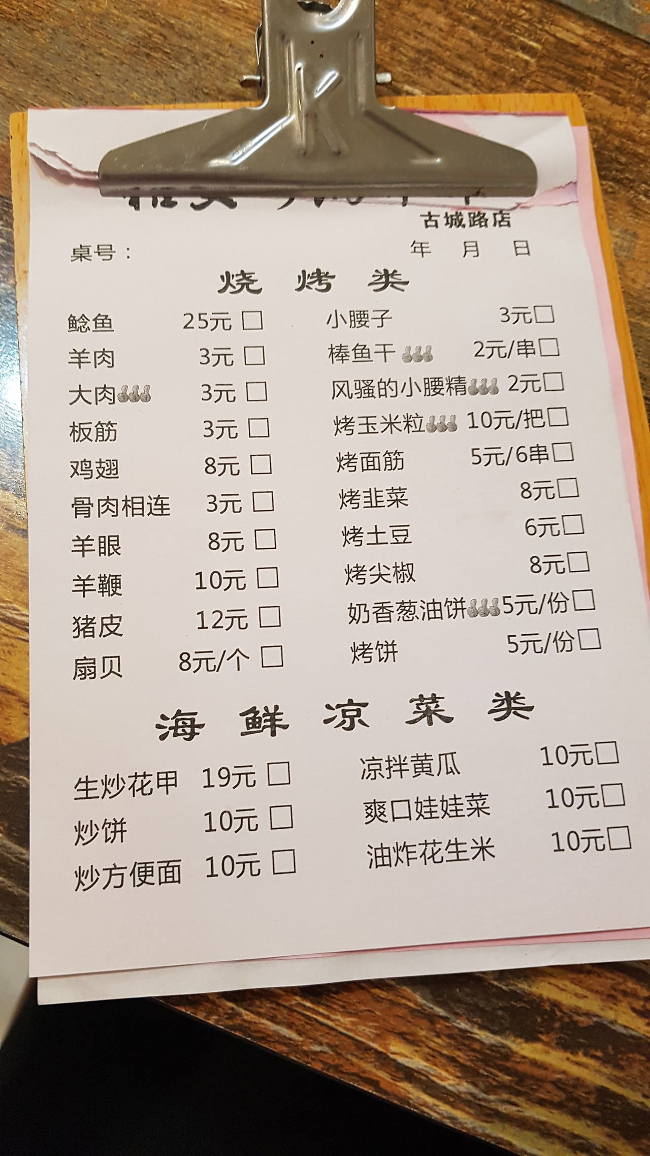 쇼핑몰 나들이를 마치고 숙소로 돌아가는 길, 생각해보니 오늘이 뤄양에서 보내는 마지막 밤이자 길었던 7박 8일 지역연구의 마지막 밤이었다. 조금 센치해지기도 했고 이 저녁을 이렇게 그냥 보내고 싶지는 않아서 즉흥적으로 꼬치구이, 그러니까 샤오카오(烧烤)를 먹으러 가기로 결정했다. 버스를 타고 숙소를 가던 도중 숙소 근처 평이 좋은 샤오카오집을 하나 발견해서 그 길로 들어간 것이다. 혼자 꼬치구이를 먹으러 가다니, 생각해보면 엄청난 용기가 필요한 일이었지만 어쩐지 그날은 그렇게 하고 싶었다.