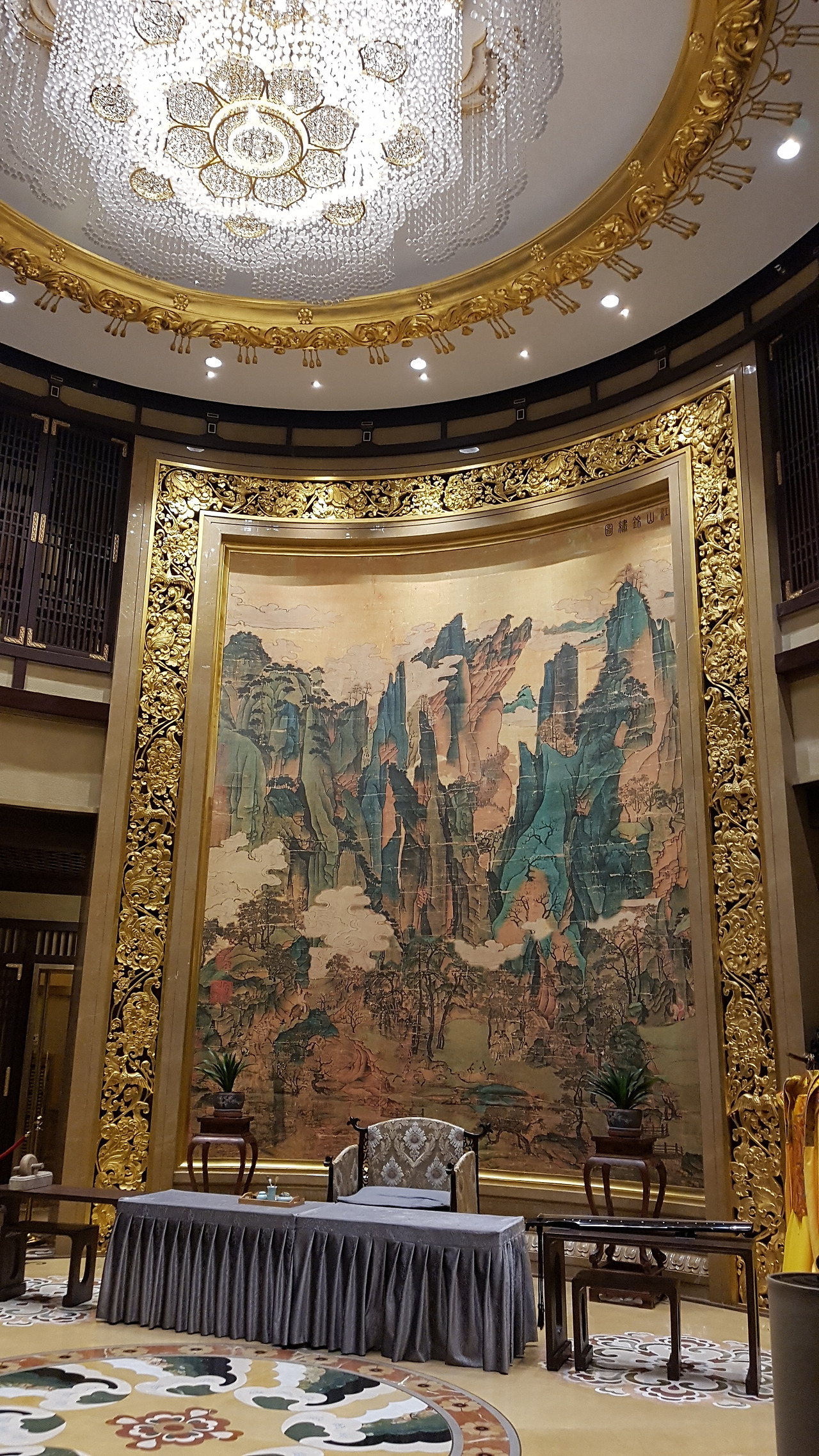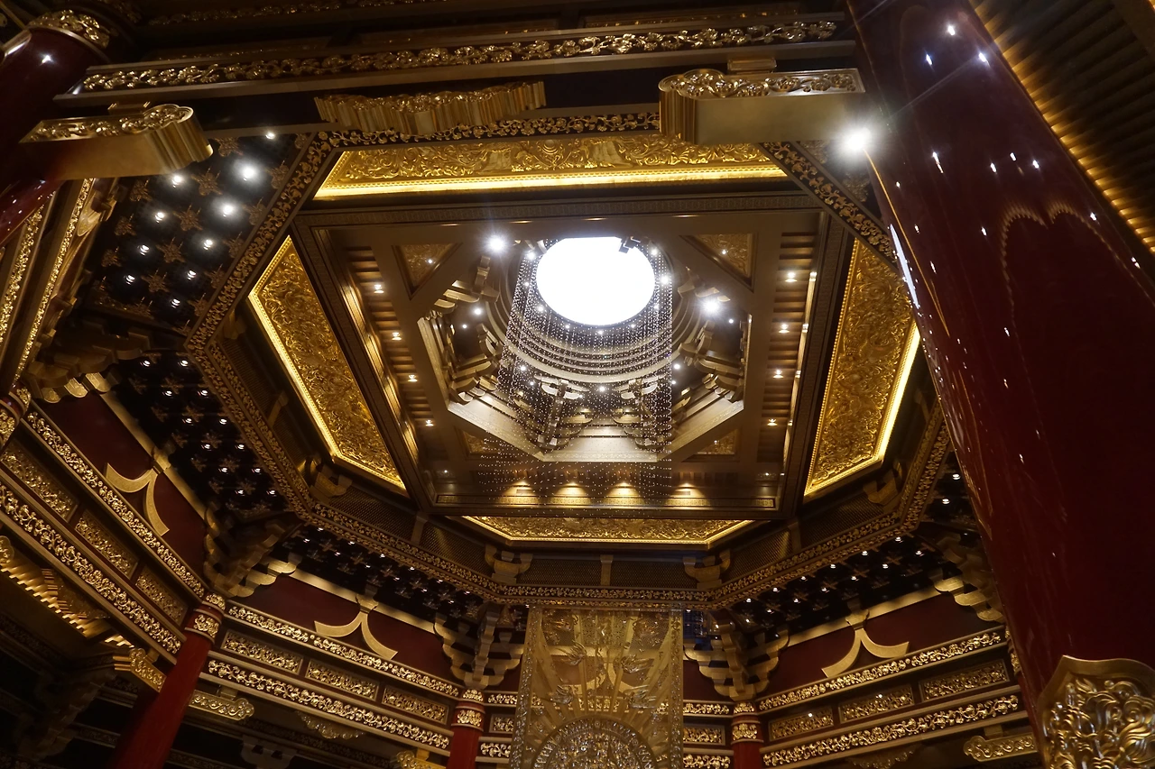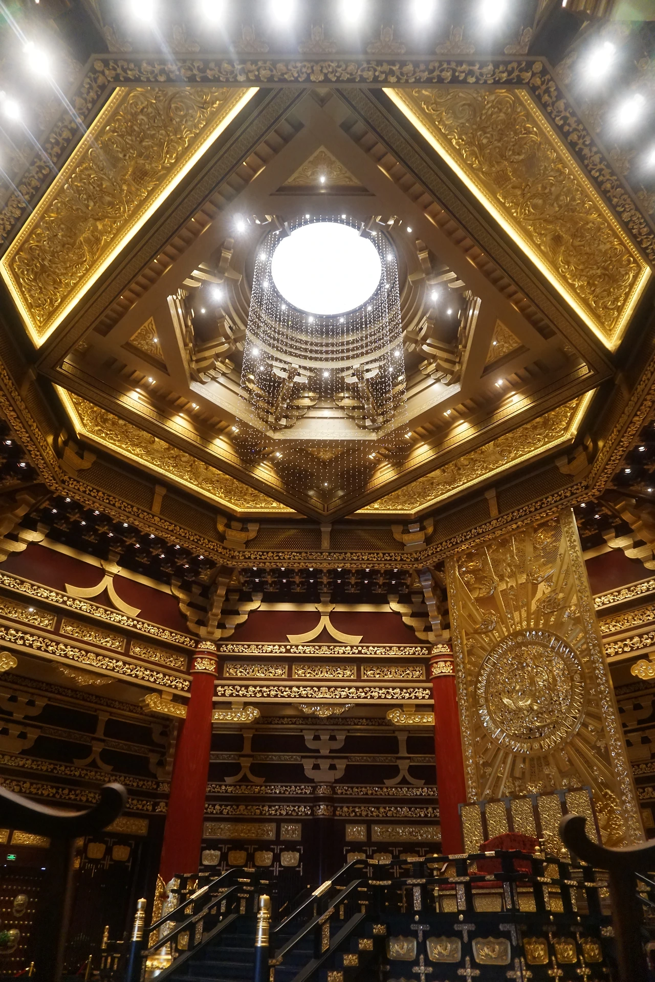 이번에는 톈탕. 톈탕은 당시 불상을 모시고 예불을 드리던 종교적인 장소라 그런지 밍탕과는 그 분위기가 사뭇 달랐다. 하지만 번쩍번쩍한 황금빛은 여전했다. 재미있는 건 여기도 무측천과 관련된 공연이 있었는데, 이번엔 관람객 중 일부를 참여시켜서 공연을 했다. 천장에는 탱화 외에도 봉황의 그림을 볼 수가 있는데, 즉위하기 전 봉황이 날아가는 모습을 보았다고 전해지는 무측천의 이야기에서 기원한 것이 아닌가 싶다.