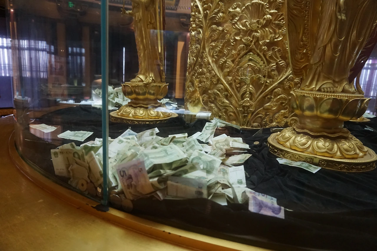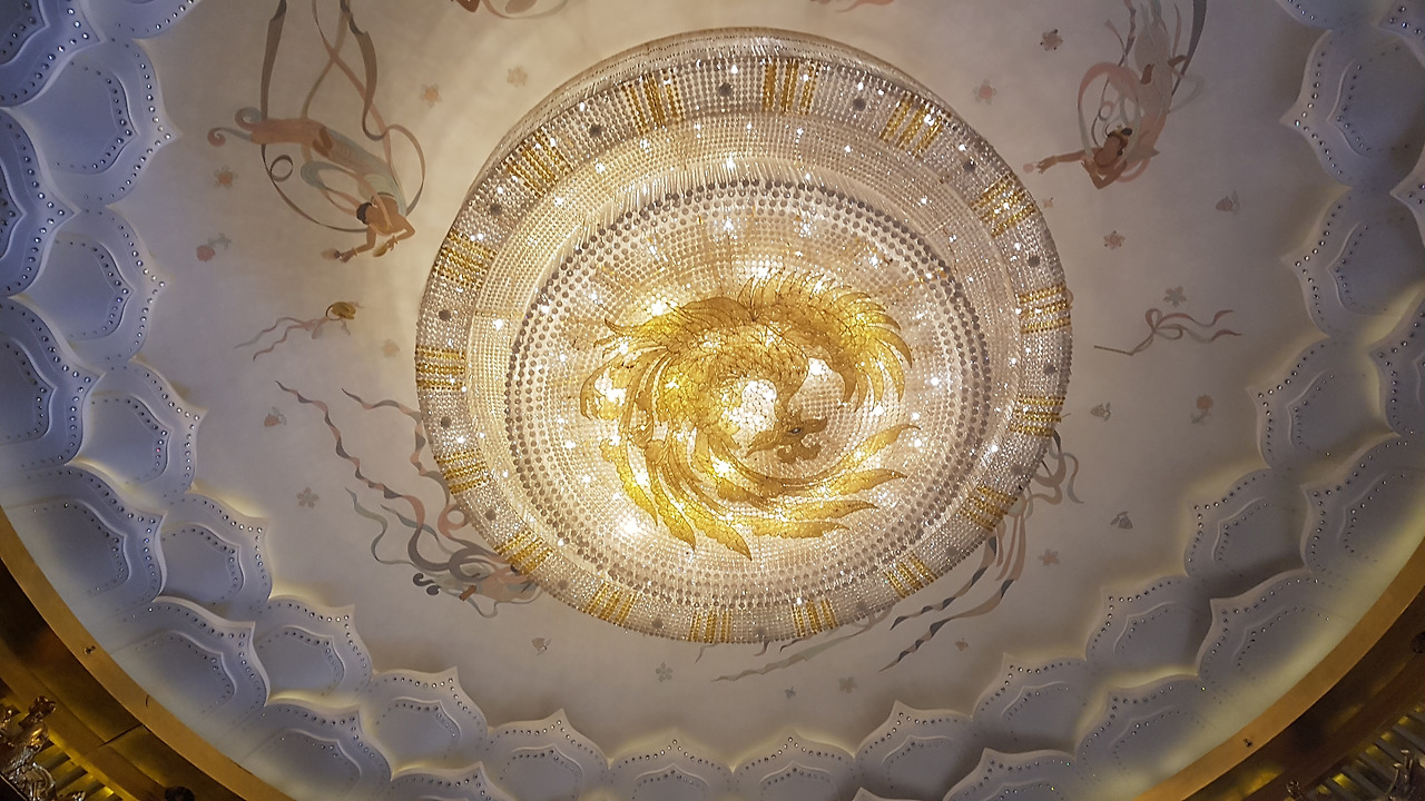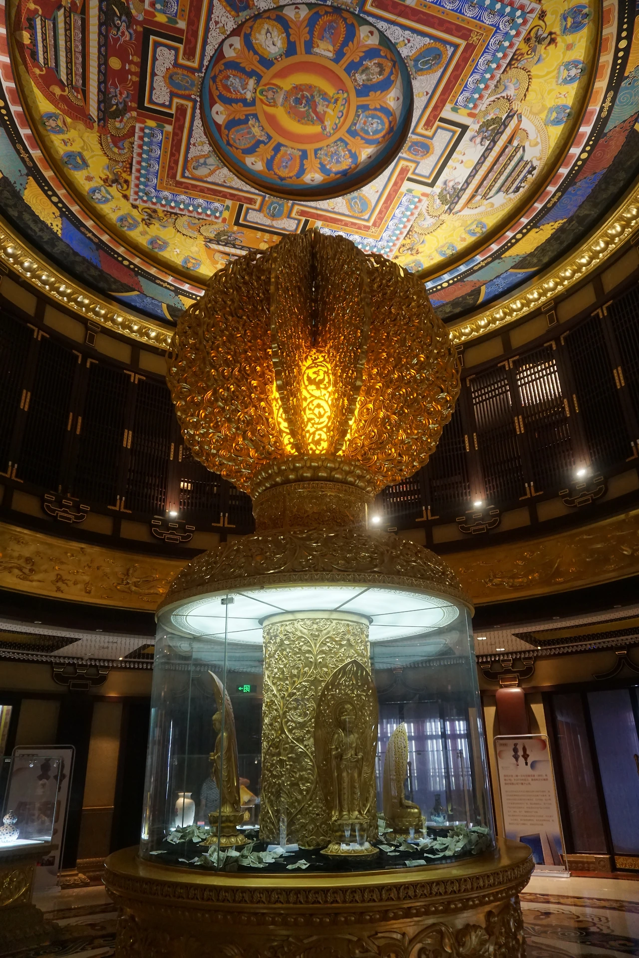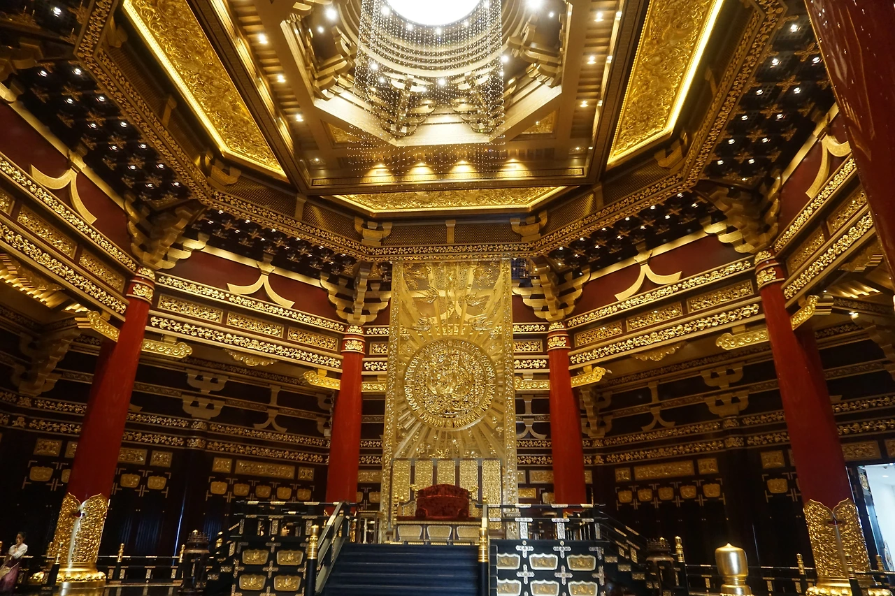 이번에는 톈탕. 톈탕은 당시 불상을 모시고 예불을 드리던 종교적인 장소라 그런지 밍탕과는 그 분위기가 사뭇 달랐다. 하지만 번쩍번쩍한 황금빛은 여전했다. 재미있는 건 여기도 무측천과 관련된 공연이 있었는데, 이번엔 관람객 중 일부를 참여시켜서 공연을 했다. 천장에는 탱화 외에도 봉황의 그림을 볼 수가 있는데, 즉위하기 전 봉황이 날아가는 모습을 보았다고 전해지는 무측천의 이야기에서 기원한 것이 아닌가 싶다.
