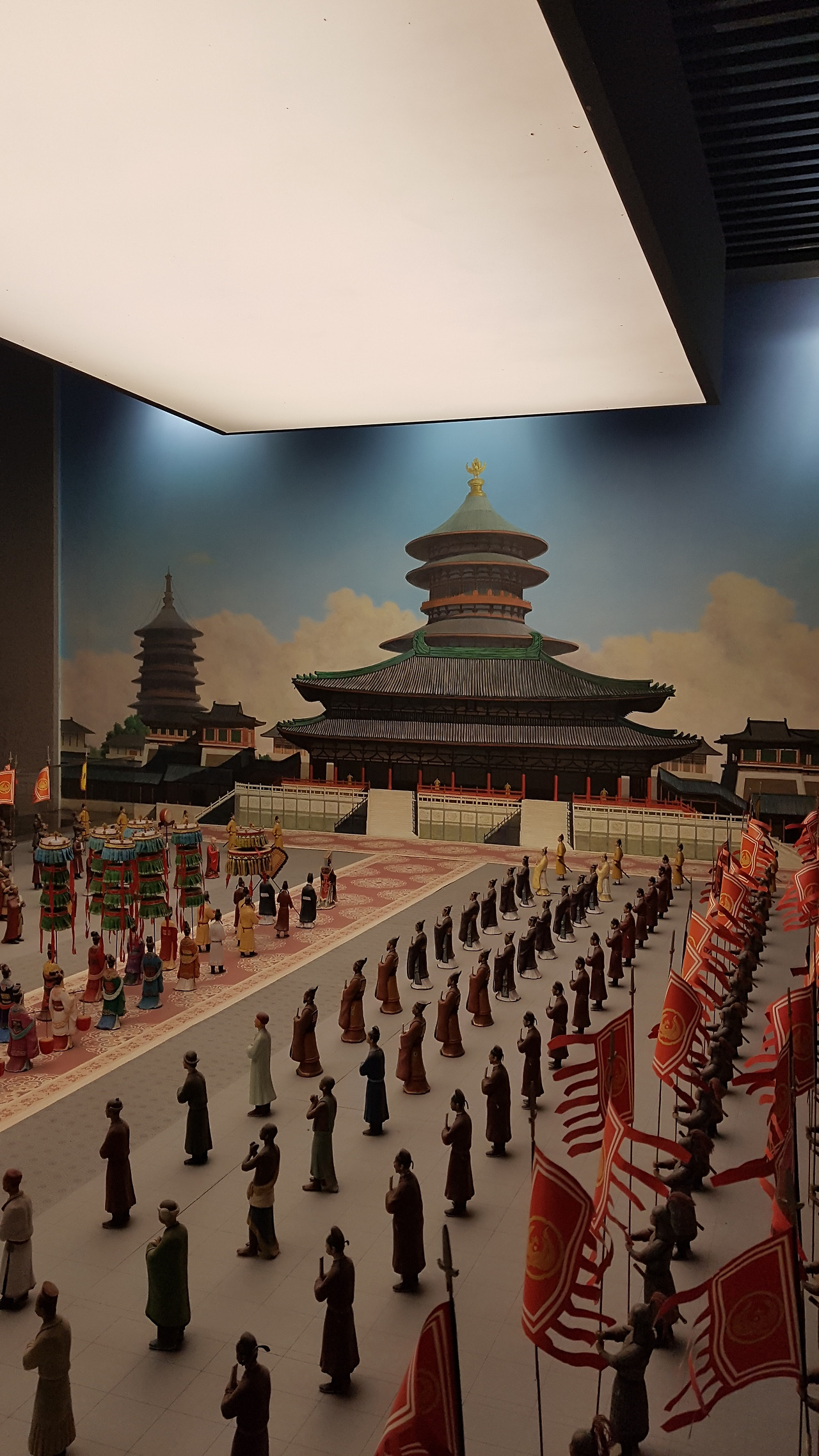 전시실 중 어떤 곳에서는 무측천의 즉위식을 재현한 모형이 있었는데, 여기 열 맞춰 서있는 사람 중 흑인도 있고 중동에서 온 것 같이 터번을 쓴 사람도 있다는 점이 재미있다. <장안십이시진(长安十二时辰)> 같은 당나라 때를 다룬 중국 드라마를 보면 당시 수도였던 장안에는 흑인이나 페르시아에서 온 사람들이 섞여 살고 있는 점을 볼 수 있는데, 실제로 당시 당나라가 다양한 지역의 문화가 섞인 국가가 아니었을까 하는 생각이 든다.