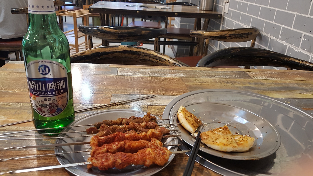 감자, 콩팥(小腰), 양고기, 돼지고기 꼬치 등을 시키면서 덩펑에서 그렇게 맛있게 먹었던 샤오빙(烧饼)을 발견해 같이 시키게 되었다. 사실 덩펑에서 먹은 것처럼 화덕에서 구워 나온 샤오빙의 비주얼을 상상했는데, 막상 점원이 가지고 온 샤오빙은 좀 다르게 생겼다. 내가 아는 그 샤오빙에 양꼬치 양념으로 쓰는 향신료를 뿌려 구워 나온 것인데, 맛이 아주 일품이었다. 이날 이 집에서 먹은 꼬치 중 샤오빙이 제일 많이 생각나고 먹고 싶다. 그 뒤로 어디에서 시켜도 이 맛이 나는 샤오빙을 먹질 못했다.