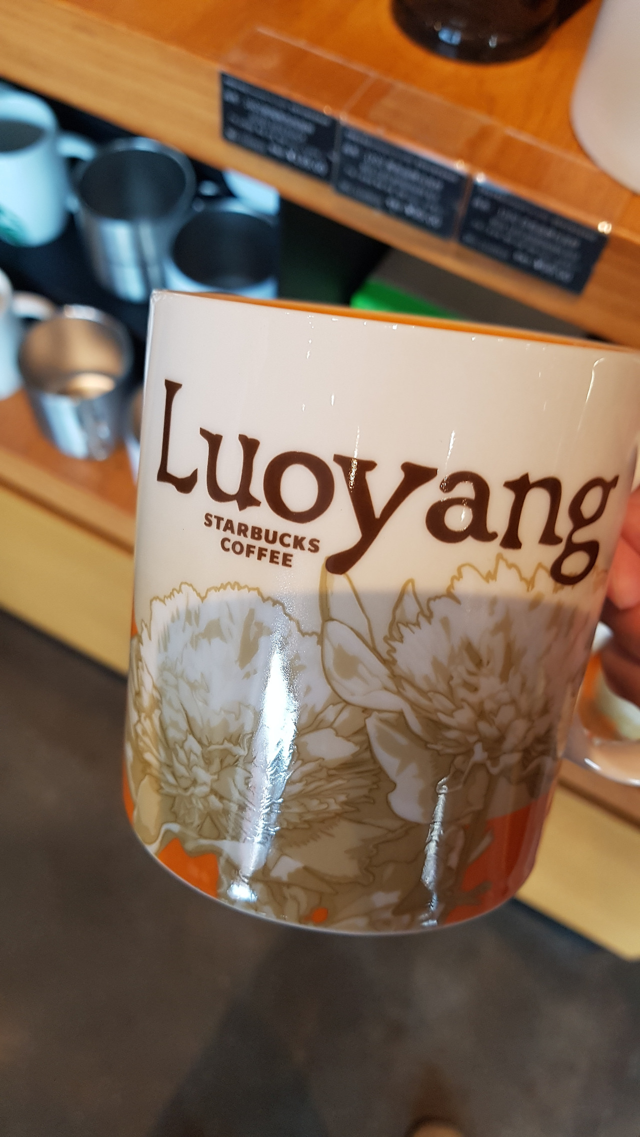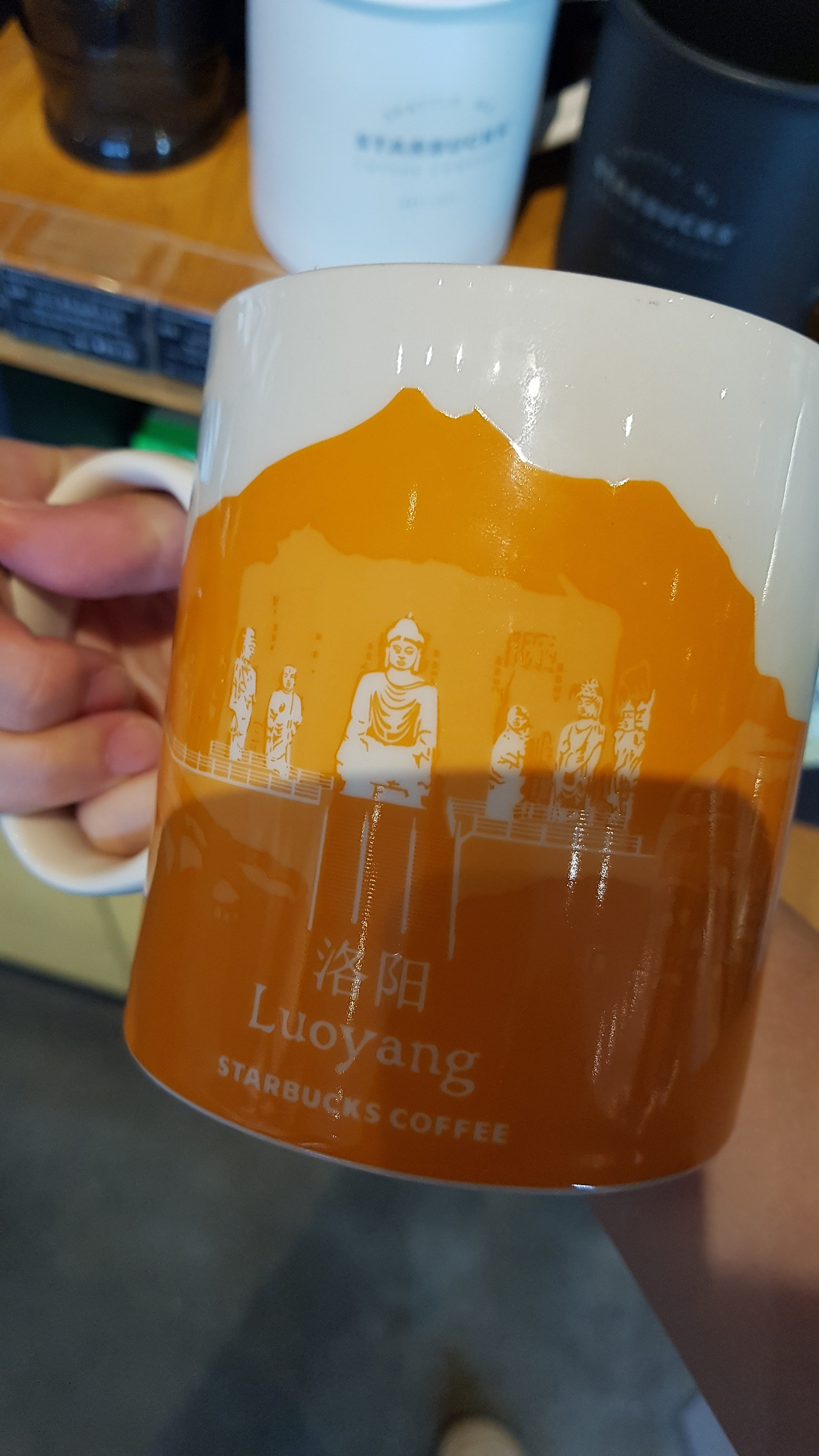그리고 찾은 왕푸징 백화점에는 뤄양에서 도저히 볼 수 없을 줄 알았던 뭔가를 발견하게 되는데.. 바로 스타벅스였다. 너무 뤄양을 얕봤나..? 중국 각지를 돌아다니면서 찾은 재미 중 하나는 시티 머그 구경인데, 뤄양의 시티 머그에는 연꽃과 용문석굴이 그려져 있었다. 문득 백마사에서 봤던 그 연꽃들이 생각났다.