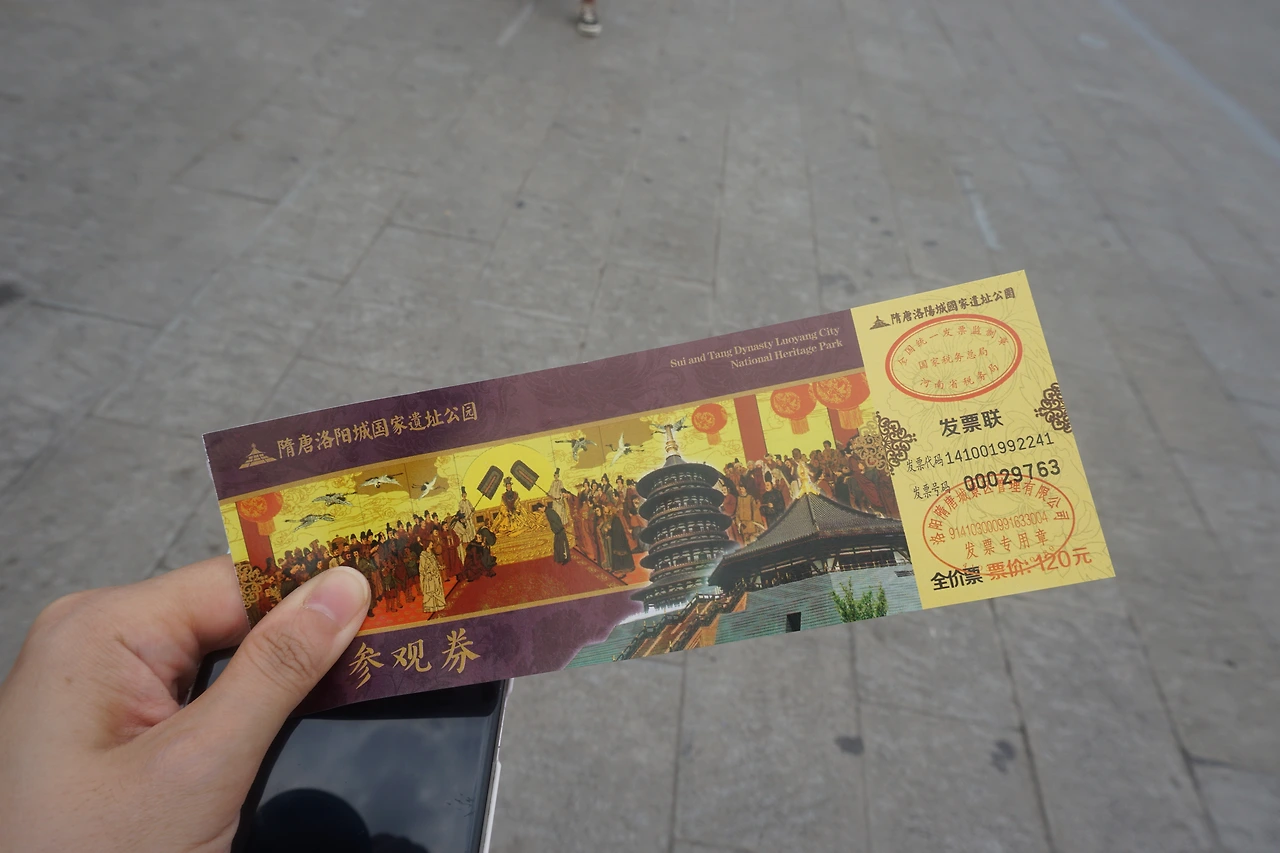 점심을 먹으며 잠시 휴식을 취한 뒤 향한 곳은 무측천이 즉위한 곳이라고 하는 수당낙양성유적지. 무측천 시대의 황궁인 밍탕(明堂)과 중국 고대에 지어진 120m에 달하는 가장 높은 건축물인 톈탕(天堂)이 있는 곳이다. 수당낙양성 자체는 이름에서 볼 수 있듯 수나라 때 처음 조성되었지만, 가장 번성했던 시기는 당나라, 특히 무측천이 뤄양 천도 후 통치할 때라고 한다. 입장권은 120 위안, 맞은편에는 잉톈먼(应天门) 유적지가 보인다.