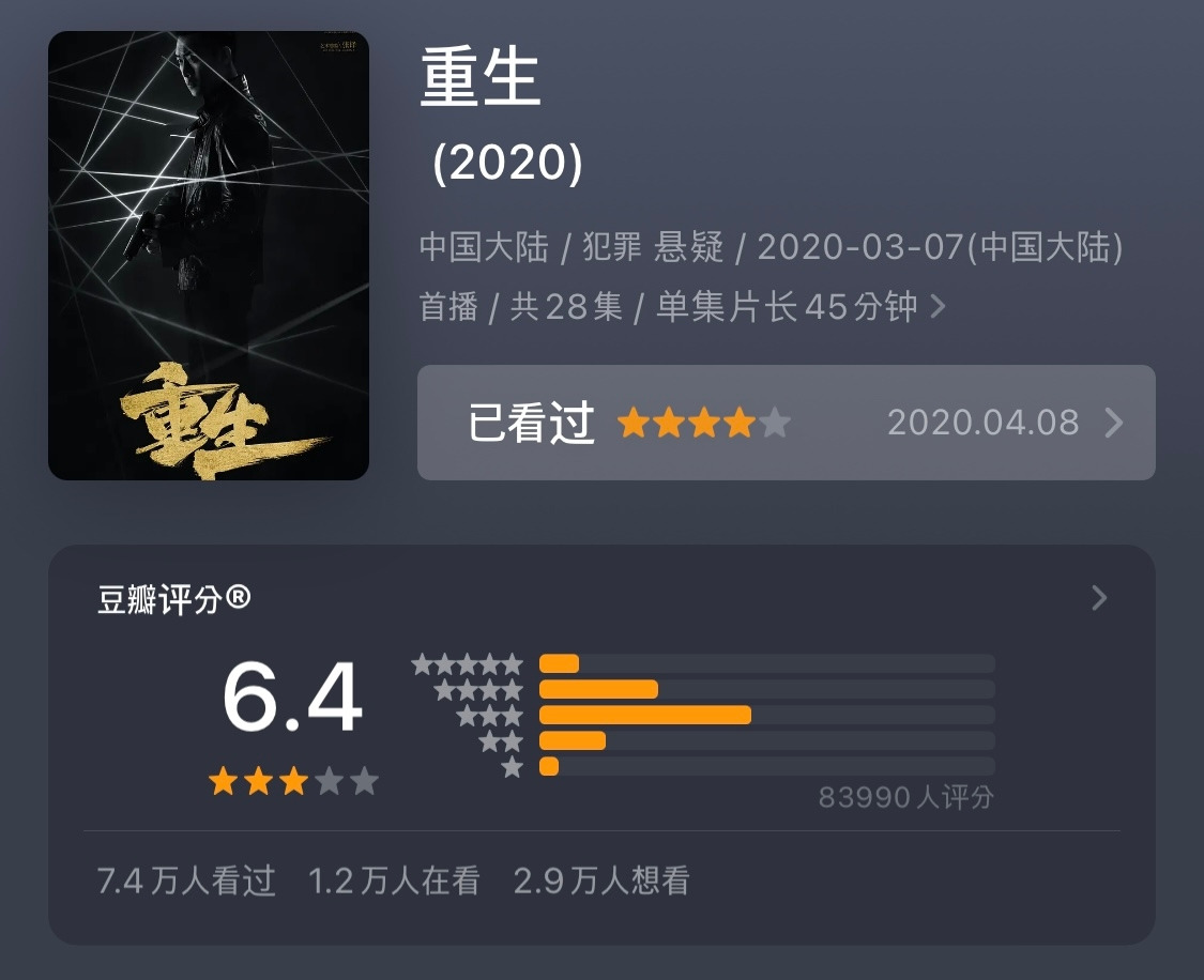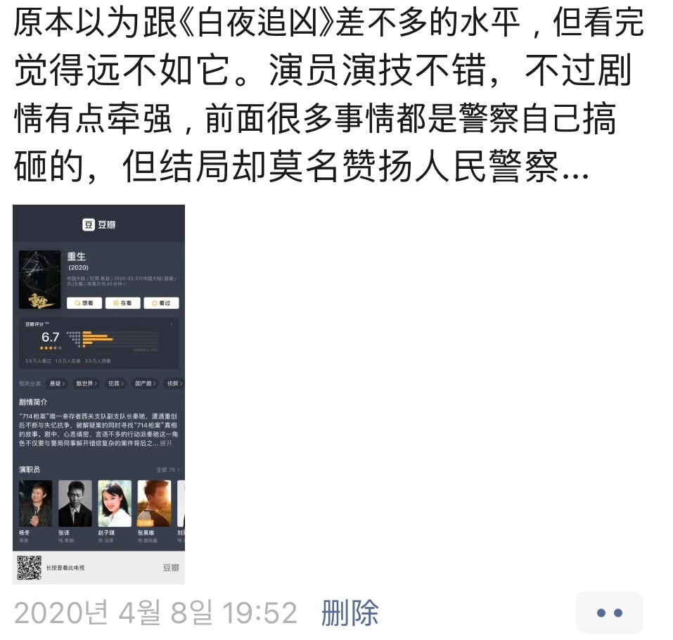 [譯] <백야추흉(白夜追凶)>과 비슷하게 재미있을 거라고 생각했는데, 보고 나니 훨씬 못 미친다. 배우들 연기는 괜찮은데, 스토리가 너무 억지스럽다. 전반부에 많은 일들을 경찰의 잘못으로 망쳤는데, 막상 결말에서는 인민경찰 찬양이라니...