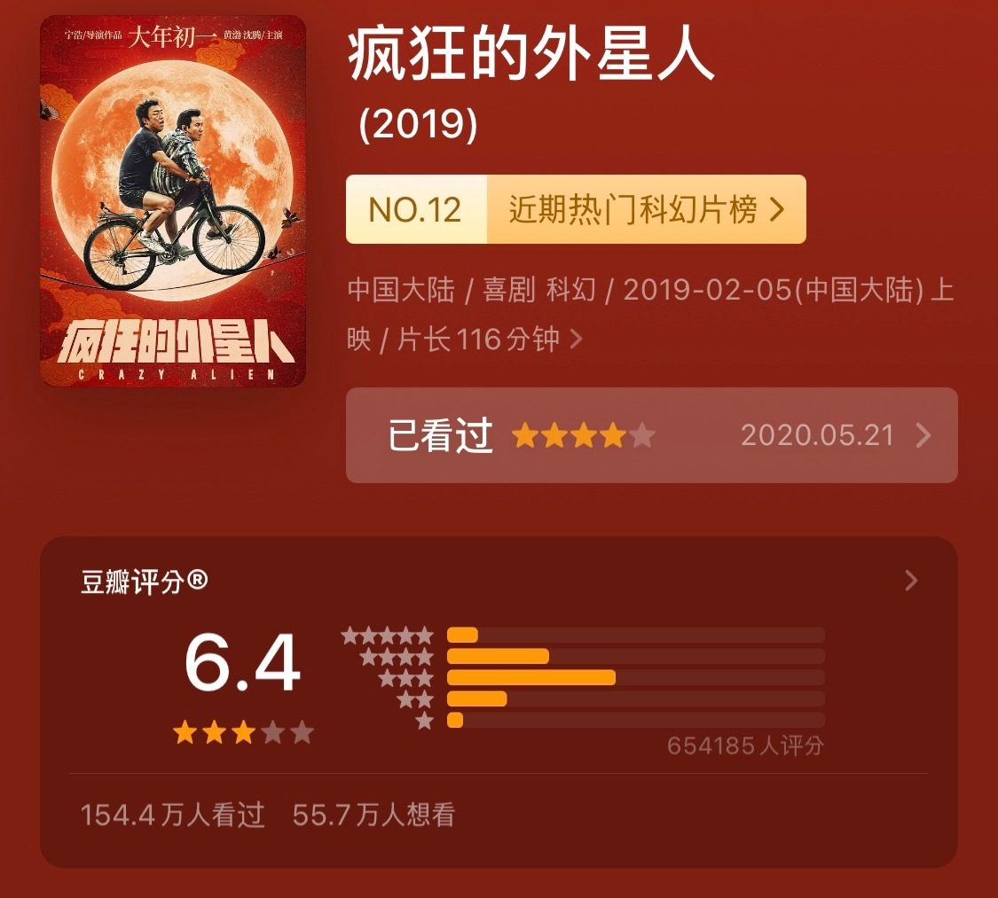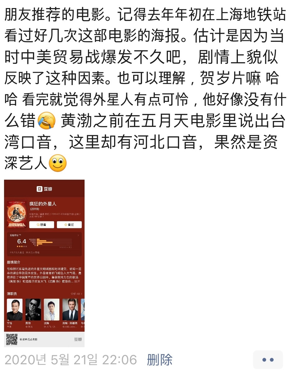[譯] 친구가 추천해준 영화. 작년 연초에 상해 지하철역에서 이 영화의 포스터를 몇 번 본 적이 있다. 아마 당시에 미중무역분쟁이 발발한 지 얼마 안 됐을 때여서겠지만, 스토리에 이런 부분이 반영된 것 같았다. 이해할 수 있다. 신년 블록버스터니까....하하 다 보고 나니 외계인이 좀 불쌍했다. 별로 잘못한 것도 없는 것 같은데... 황보(黄渤)는 오월천 영화에서 대만 발음으로 연기하더니 여기서는 허베이 발음으로 연기를 한다. 역시 프로는 다르다.