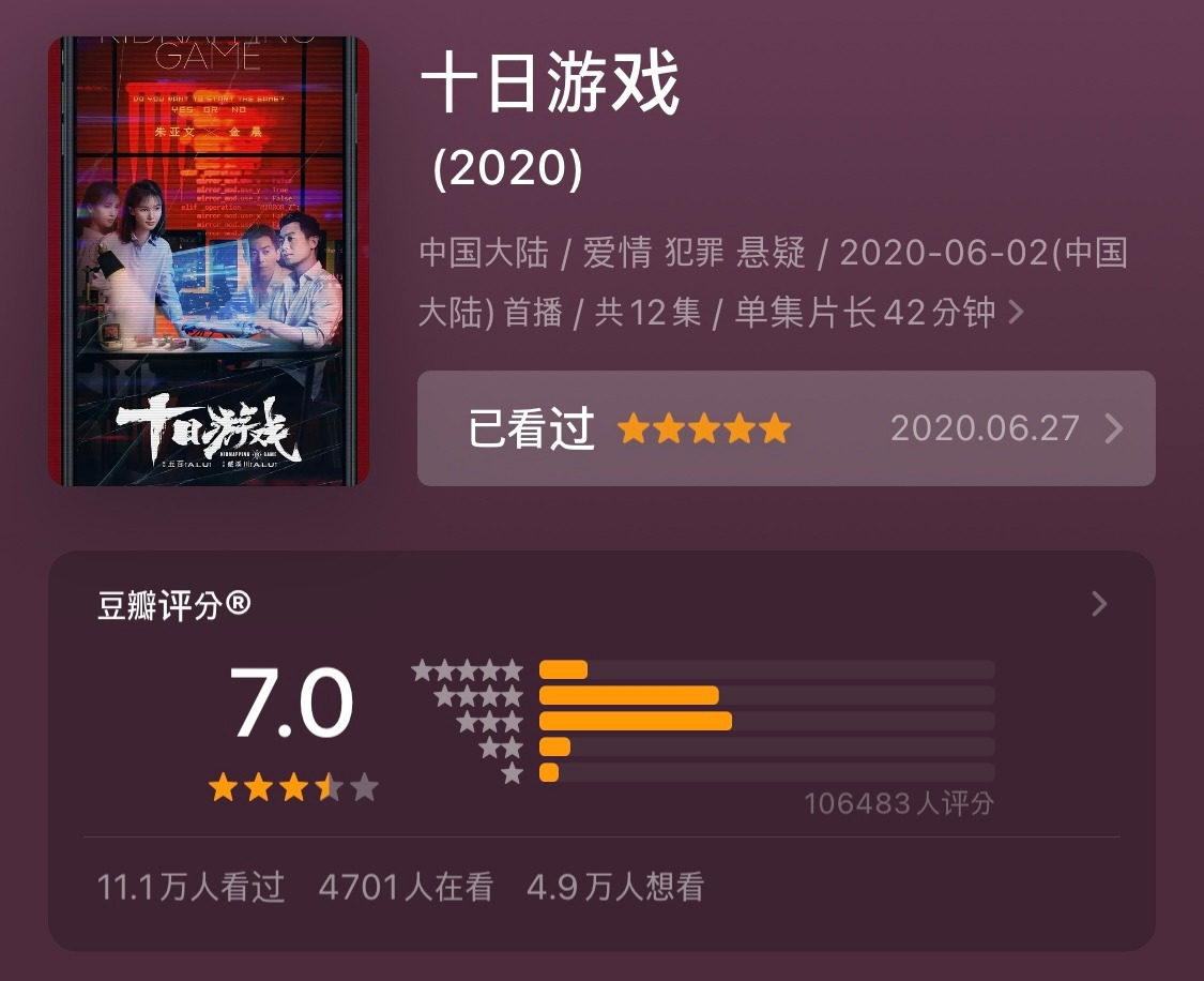 · 배경은 가상의 도시 뤼텅(绿藤). 주로 이런 수사극, 스릴러극의 배경으로 많이 나오는 가상의 도시임. 제목으로 대충 유추 가능하듯 주인공들이 일종의 '게임'으로 납치극을 벌이는 것으로부터 시작하는 드라마인데, 나름 반전도 있고 애정씬도 있고 베테랑 배우들도 나와서 재미있게 볼 수 있음.