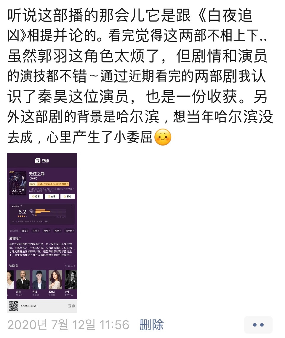 [譯] 들리는 소문으로는 이 드라마가 방영할 때 <백야추흉(白夜追凶)>과 용호상박이었다고 하던데, 다 보고 나니 그 말이 사실인 것 같다. 비록 꿔위(郭羽)라는 인물은 정말 짜증나지만, 스토리와 배우들 연기 모두 괜찮았다. 최근 본 드라마 두 편으로 친하오(秦昊)라는 배우를 알게 되었는데, 이 역시 큰 수확이다. 이 드라마의 배경이 하얼빈인데, 지전가 때 하얼빈 못 간 게 너무 아쉽다..