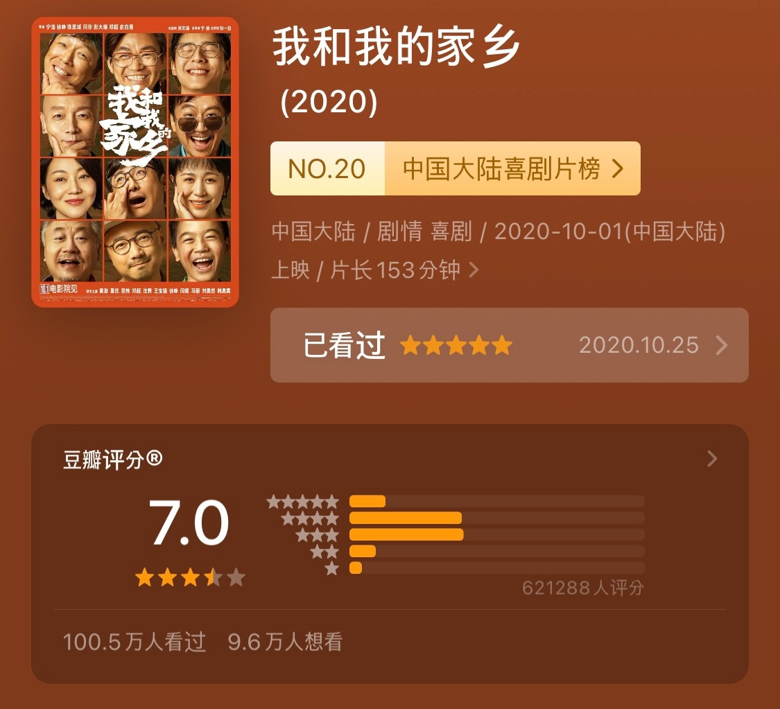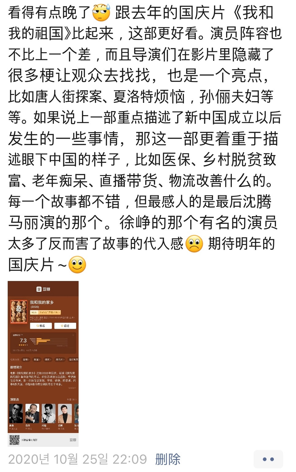 [譯] 좀 늦었다..ㅎㅎ 작년 국경절에 나왔던 영화 <아화아적조국>이랑 비교했을 때, 이 영화가 더 재밌는 것 같다. 배우진도 전작보다 못하지 않고, 감독들이 영화 속에 당인가탐안, 하락특번뇌, 쑨리 부부 등 다양한 드립들을 숨겨놔서 볼만하다. 전작이 신중국 성립 이후 발생했던 다양한 사건들을 서술하는 데 중점을 뒀다면, 이번 영화는 의료보험이나 향촌 빈곤 탈출 활동이나 노년 치매, 라이브 방송, 물류 개선 등과 같은 중국의 현재 모습을 보여주려고 노력했다. 모든 이야기가 다 괜찮았는데, 제일 감동적이었던 건 맨 마지막 션텅과 마리가 나왔던 이야기였다. 쉬정이 나오는 부분은 유명한 배우는 진짜 많이 나왔는데 오히려 그래서 감정 이입이 잘 안 되었다. 내년 국경절 영화도 기대된다~