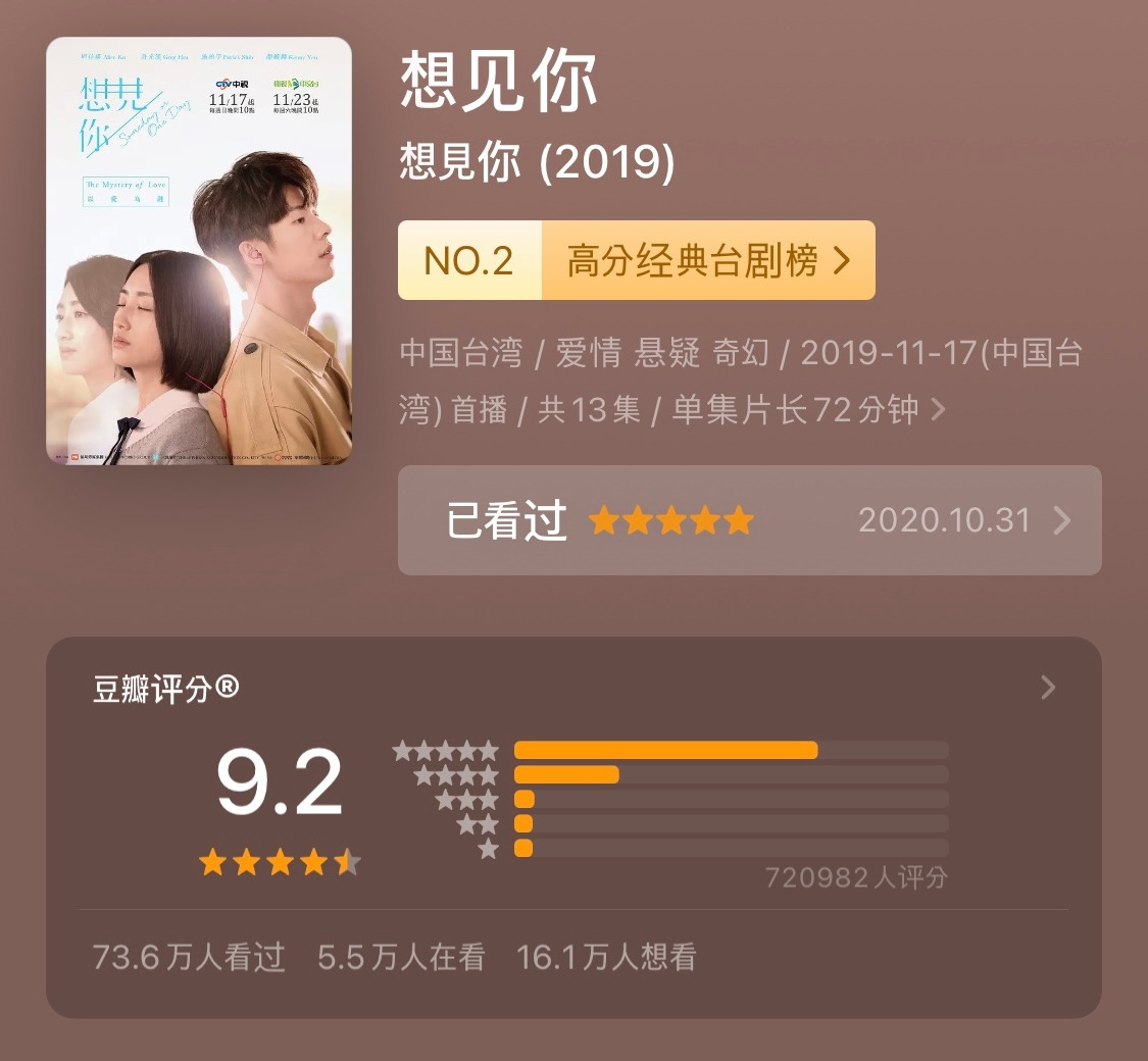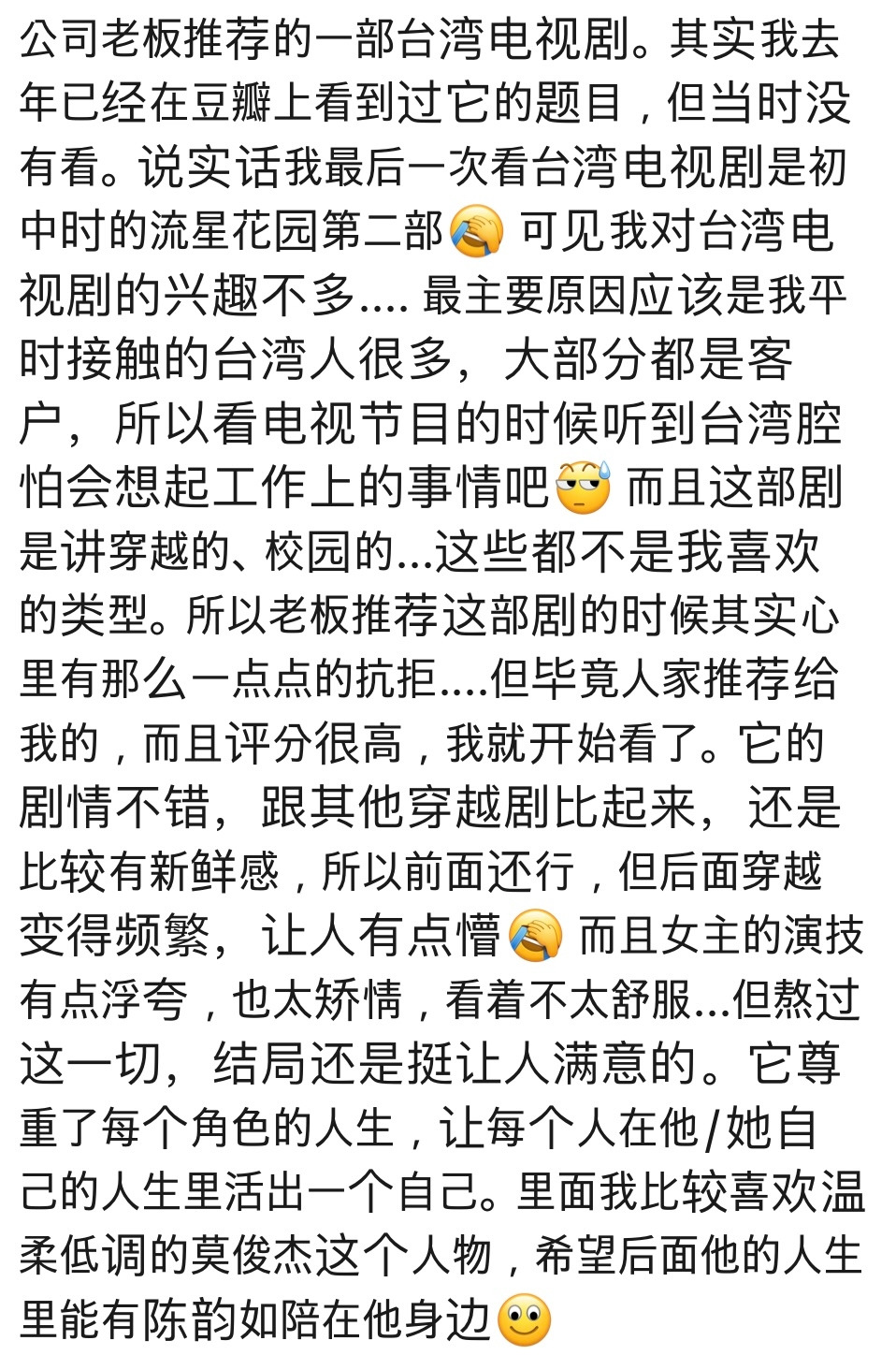[譯] 회사 상사분께서 추천해주신 대만 드라마. 사실 작년부터 또우빤 랭킹에서 이 드라마 제목을 봤는데, 보진 않았다. 내 마지막 대만 드라마는 중학교 때 본 <유성화원 2>란 말이지.. 대만 드라마에 그닥 흥미가 없어서;; 아마 평소 대만 사람들을 일로 너무 자주 접하고, 대부분 거래선이라.. 그래서 드라마를 볼 때 대만 말투를 들으면 일하는 느낌이 들어서 잘 안 보게 되는 듯. 게다가 이 드라마 타임슬립도 나오고, 학원물이고.. 내가 별로 안 좋아하는 요소들 투성이라 상사분께서 추천해주셨을 때 솔직히 볼 생각이 안 들었다. 하지만 어쨌든 추천받았으니까, 게다가 평점도 높으니 한번 보기로 하고 보기 시작했다. 스토리는 괜찮다. 다른 시간여행 드라마들에 비해서 신선하고. 그래서 전반부는 재밌었다. 근데 후반부로 갈수록 타임슬립이 너무 자주 일어나서 좀 머리가 아팠다. 게다가 여자 주인공 연기가 좀 과해서 보기가 좀 힘들었다. 하지만 이 모든 것을 견뎌낸 뒤 맞이한 결말은 꽤 만족스러웠음. 모든 인물의 인생을 존중해주고, 모든 인물이 자신의 삶 속에서 자기 자신으로 살아갈 수 있게끔 만들어준 것 같다. 드라마 속에서 나는 따뜻하고 조용한 모쥔졔가 좋았다. 그의 이후의 삶에는 천윈루가 옆에 있길...