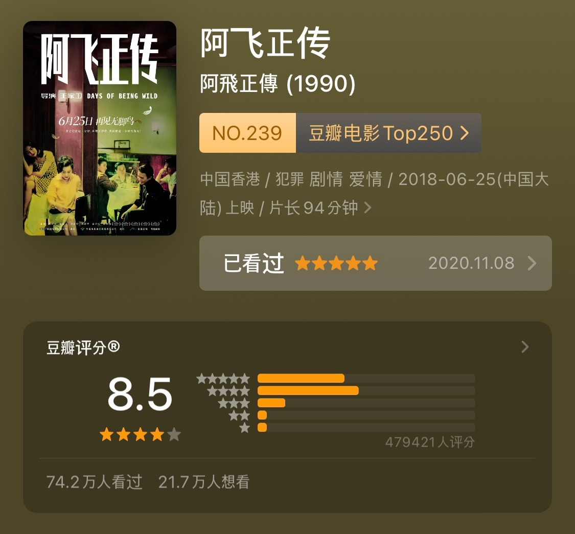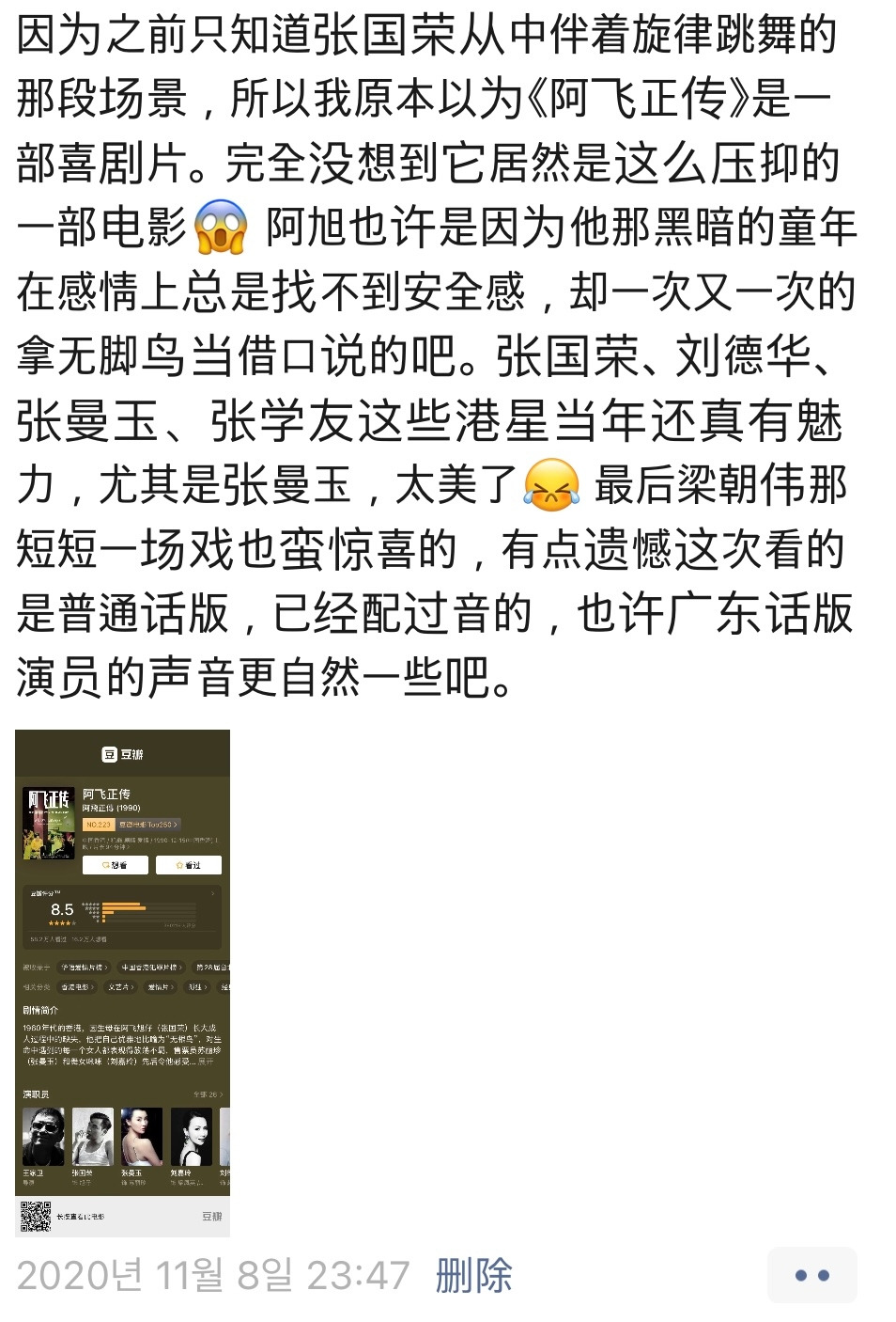 [譯] 이전에 장국영이 영화 속에서 멜로디에 맞춰 춤추는 장면만 알고 있었어서, 난 이 영화가 코믹영화인 줄 알고 있었다. 이렇게 우울한 영화일 줄은... 아쉬는 아마도 자신의 어두웠던 어린 시절 때문에 사랑에 있어서 늘 안정감을 찾지 못하고 매번 '무각조(다리가 없는 새)'를 핑계로 말했던 것일 테다. 장국영, 유덕화, 장만옥, 장학우 등 홍콩 스타들, 당시엔 정말 매력이 있었던 것 같다. 특히 장만옥. 너무 예쁘다.. 마지막에 나온 양조위는 짧게 나왔지만 꽤 놀라웠다. 이번에 본 게 보통화 버전이라 이미 더빙이 된 버전이라 좀 아쉽다. 아마 광둥어 버전이었다면 배우들의 목소리가 훨씬 자연스러웠을 듯..