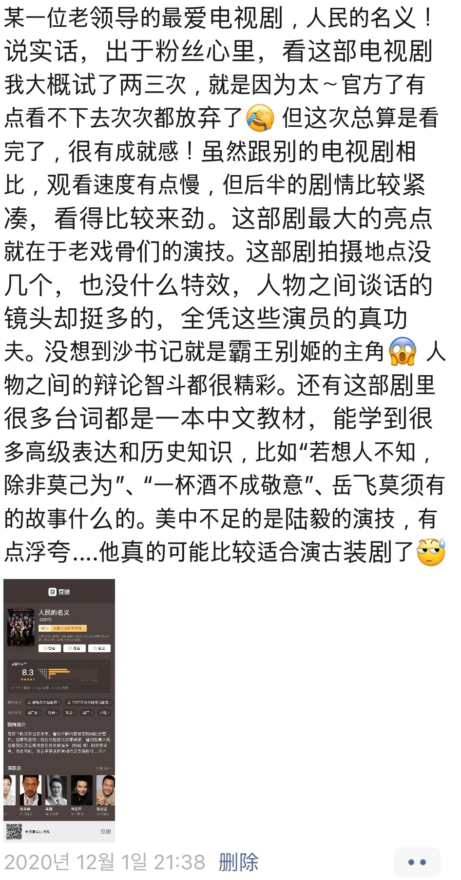[譯] 한 상사분의 최애 드라마, 인민적명의! 사실 (상사분에 대한) 팬심으로 이 드라마를 보려고 두세 번 시도했었는데, 너~~~~무 공산당 색채가 강해서 번번이 포기했었다.. 이번에 겨우 다 봤다. 보람차다! 비록 다른 드라마에 비해 속도는 좀 안 났지만, 후반부 스토리가 비교적 쫀쫀해서 재밌었다. 이 드라마의 가장 큰 장점은 베테랑 배우들의 연기. 촬영 장소도 몇 군데 안 되고, 특수효과도 거의 없고, 인물 간 대화하는 씬이 꽤 많은데, 이 씬들을 배우들의 능력으로 커버한 느낌이다. 샤 서기가 <패왕별희>의 그 남자 주인공이라니..! 인물 간 논쟁과 머리싸움이 정말 볼만하다. 그리고 드라마 속 많은 대사들이 중국어 교과서 같아서, 고급 표현이나 역사 지식도 많이 알아갈 수 있었다. 예를 들면, "若想人不知,除非己莫为(다른 사람이 모르게 하려면, 자기가 안 하는 수밖에 없다)"라든가 "一杯酒不成敬意(한잔 올리겠습니다)", 또 악비의 "莫须有" 이야기 같은. 유일한 단점은 루이의 연기.. 좀 과장됐다. 이 배우는 어쩌면 정말 사극 연기에 적합한 사람일지도....