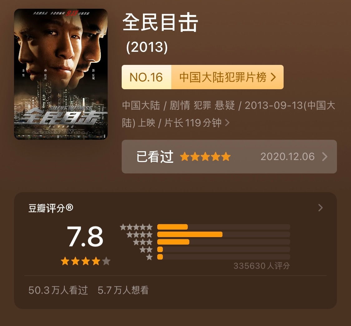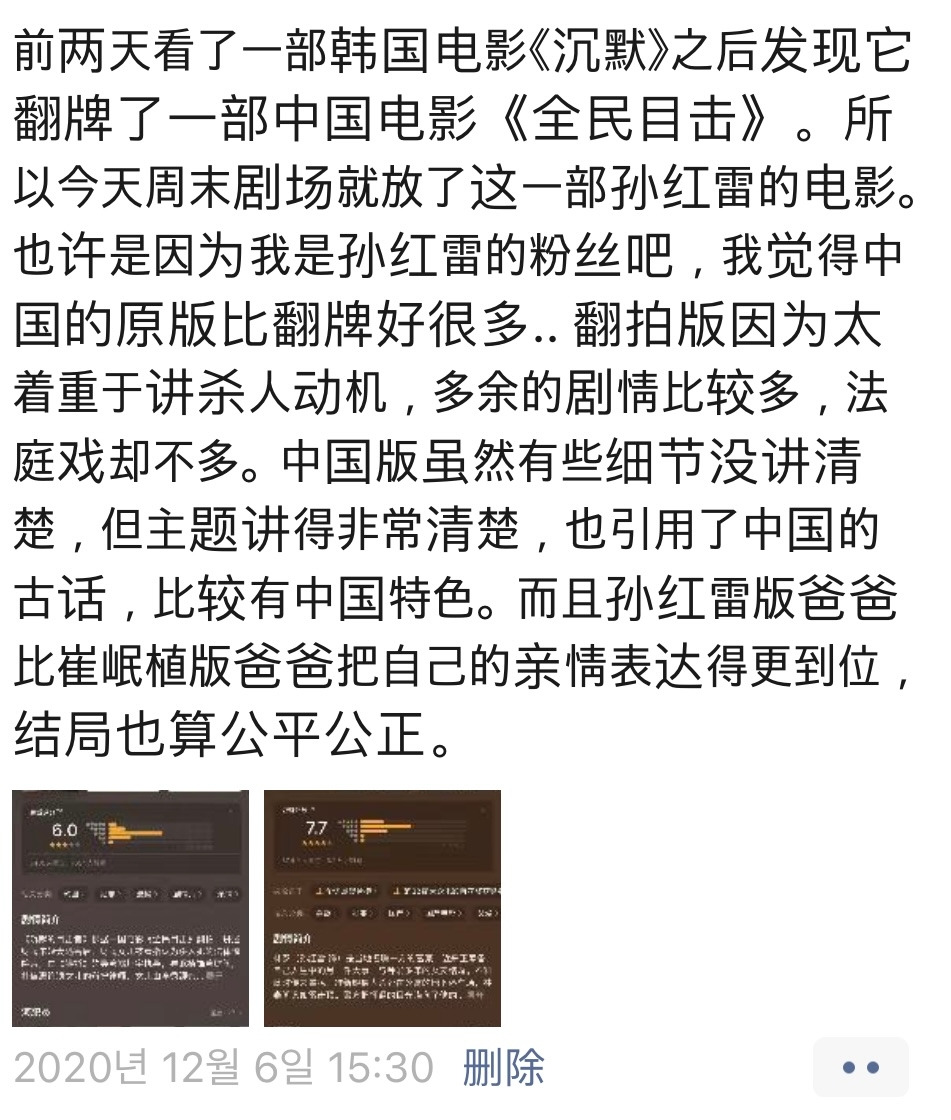 [譯] 며칠 전 한국 영화 <침묵>을 본 뒤 이 영화가 중국 영화 <전민목격>의 리메이크작이라는 것을 알게 되었다. 그래서 주말에 이 쑨홍레이(孙红雷)가 나온 영화를 보기로 했다. 아마도 내가 쑨홍레이의 팬이라서 그럴 것 같은데, 중국 버전이 리메이크작보다 더 나은 것 같다. 리메이크 버전은 살인 동기를 서술하는 데 너무 초점을 맞춰서 불필요한 스토리가 좀 많고 법정 씬은 별로 없었다. 중국판은 비록 디테일을 잘 말하진 못했지만 주제는 잘 살렸고 중국의 옛이야기를 인용하여 중국적인 특색도 있었다. 게다가 쑨홍레이가 연기하는 아빠가 최민식이 연기하는 아빠보다 부모로서의 사랑을 더 잘 표현한 것 같고, 결말도 비교적 공평하고 공정했다고 본다.