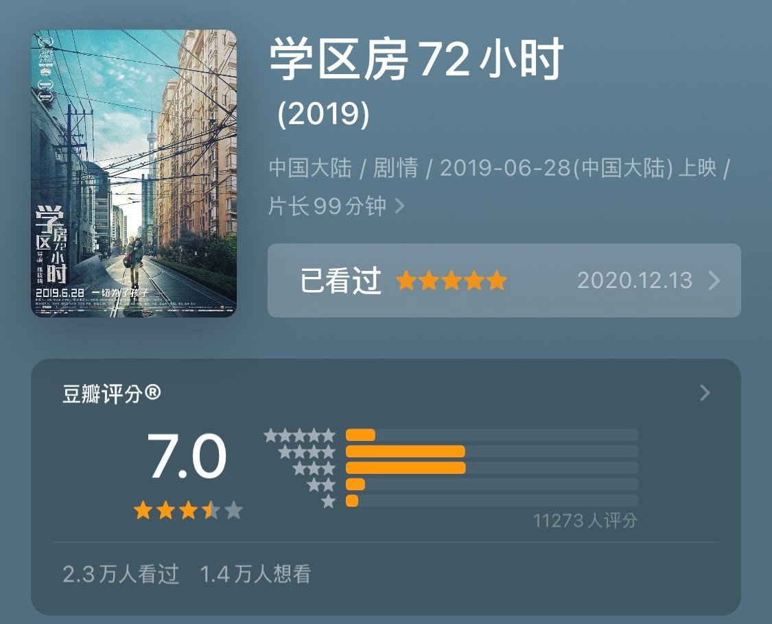 . 영화 속에는 1선 도시 상하이에서 좋은 입지의 학구방을 얻을 돈을 마련하기 위해 갖고 있는 집을 72시간 안에 팔아야 하는 아빠가 나온다. 놀라운 것은 그 아빠가 학구방을 구하는 목적이 아이를 명문 초등학교(重点小学)에 보내기 위한 것이라는 점이다. 초등학교부터 좋은 곳을 가야 에스컬레이터식으로 고등학교까지 쭉 이어질 수 있다는 믿음 때문이다. 그리고 그와 대조적으로, 아들을 위해 신혼집을 얻으려고 하는 엄마도 나온다. 둘 다 자식이 행복했으면 하는 마음으로 하는 일인데, 그 과정은 지난하고 결국 무엇을 위한 집 얻기인지 나중에는 모호해져버린다. 영화는 그 씁쓸한 현실을 이야기한다.