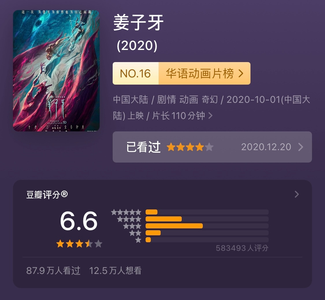 . 20년 초 상하이에 있을 때 극장에서 이 영화 포스터를 봤는데, 아마도 코로나로 인해 개봉이 늦춰져 10월에나 개봉한 것 같음. 볼 영화를 찾다가 마침 <나타지마동강세(哪吒之魔童降世)>를 이미 봤기에 그 연장선상으로 이 영화를 보기로 함.